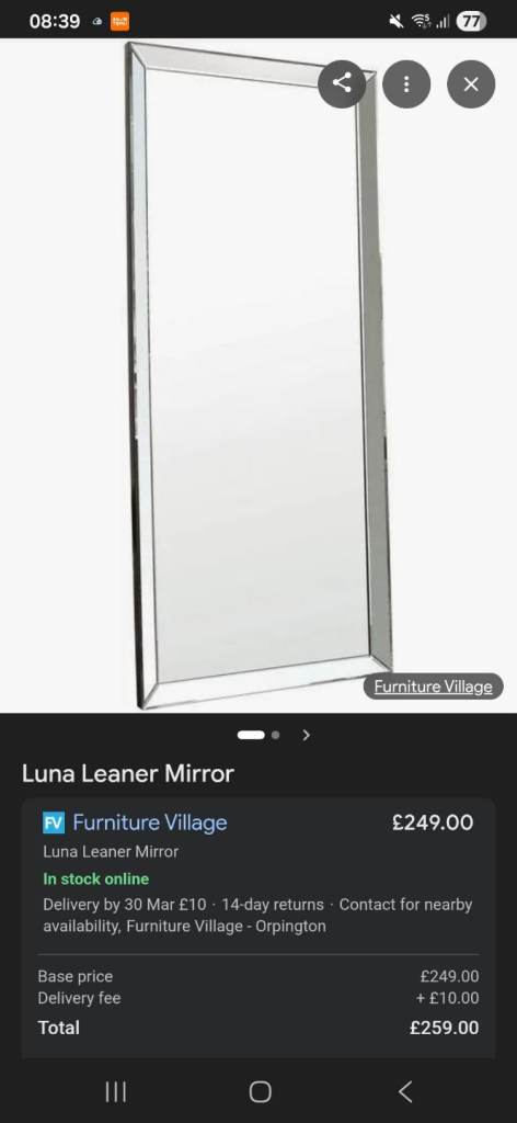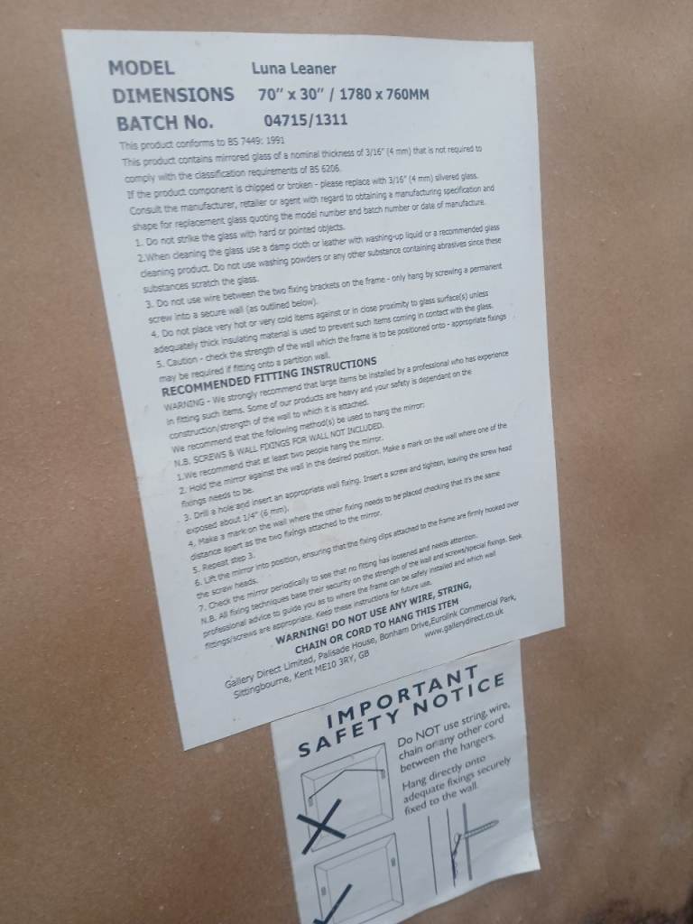 Luna leaner mirror measurements on pictures....very good condition except small crack (line) on the frame at the bottom as shown in pics...doesn't affect the mirror atall, very big, very heavy, great statement piece welcome to view. Orinally £250