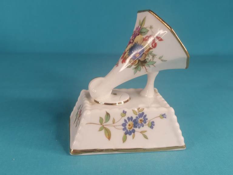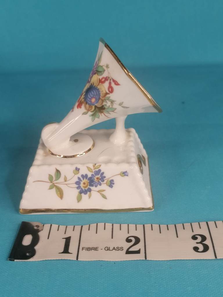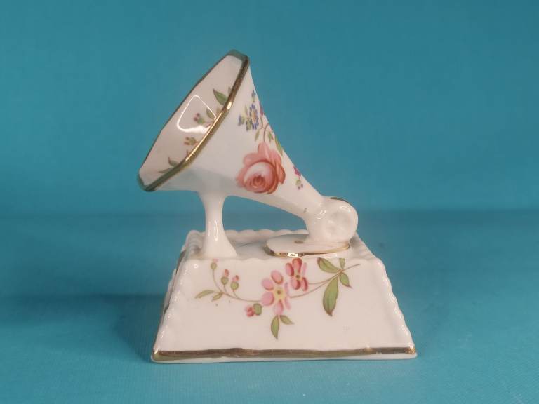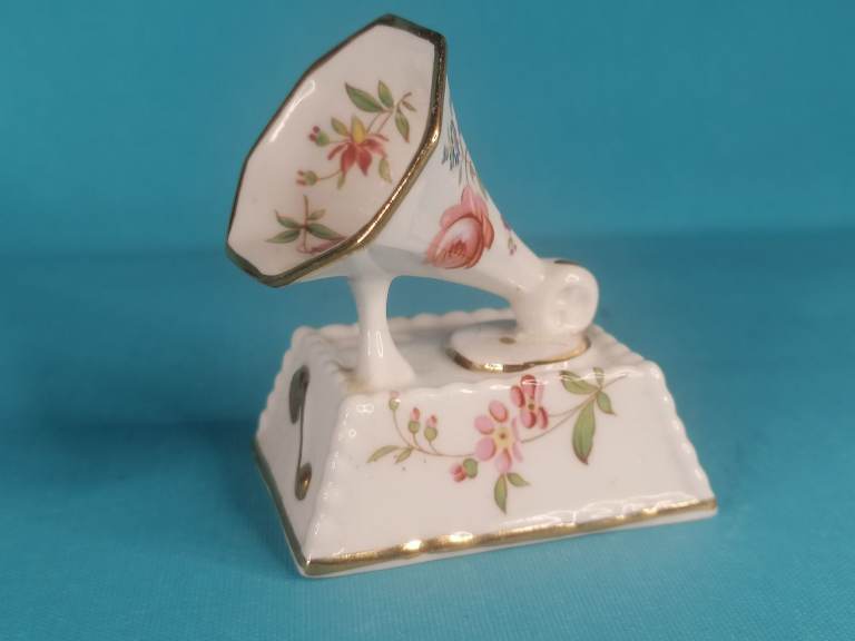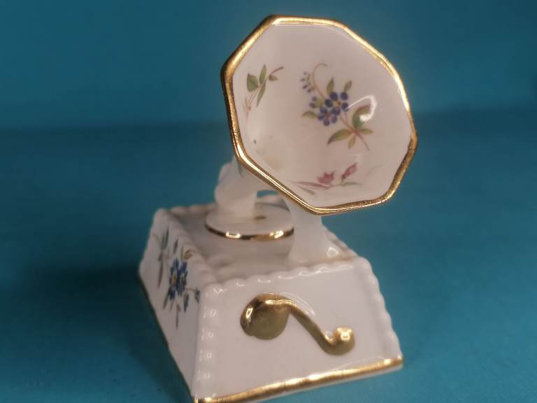 Miniature Bone China Gramophone - Roses Design Hammersley Miniature. Made in England.