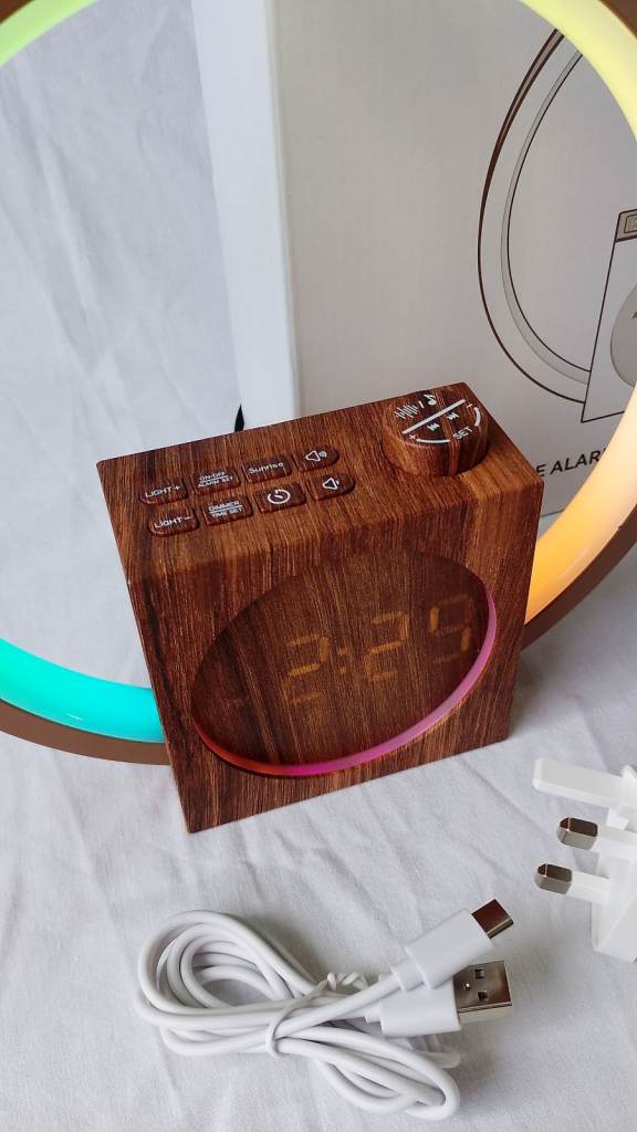 Wake gently with 7 soothing tones, from nature sounds to white noise, or light-only mode for a silent start. The light gradually brightens over 10-60 minutes, mimicking a real sunrise, helping you rise refreshed instead of jolted awake. SNOOZE adds 9 minutes of cosy rest. Crafted with an elegant wood-grain finish, this sunrise alarm clock doubles as a stylish bedside lamp. Tap to switch between 12 ambient colours and adjust 20 dimming levels to brighten gloomy winter mornings or create a calming glow on rainy nights. The clock display offers 4 adjustable levels or can be turned off completely, so it stays clear in the day and comfortably dim at night.