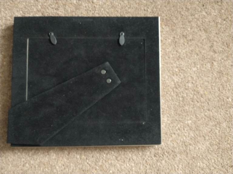 Solid, weighty frame. Freestanding for 5 x 7ins. photo. Portrait or landscape. Black velvet backing. Total height - 9ins. Width 8ins. Depth of frame 1 ins. Photo when inserted does not lie flat on glass, it is set furthe back as intended. New condition. Unused.