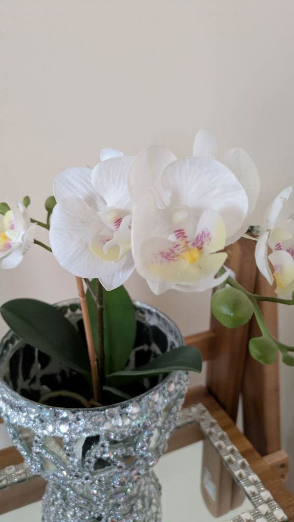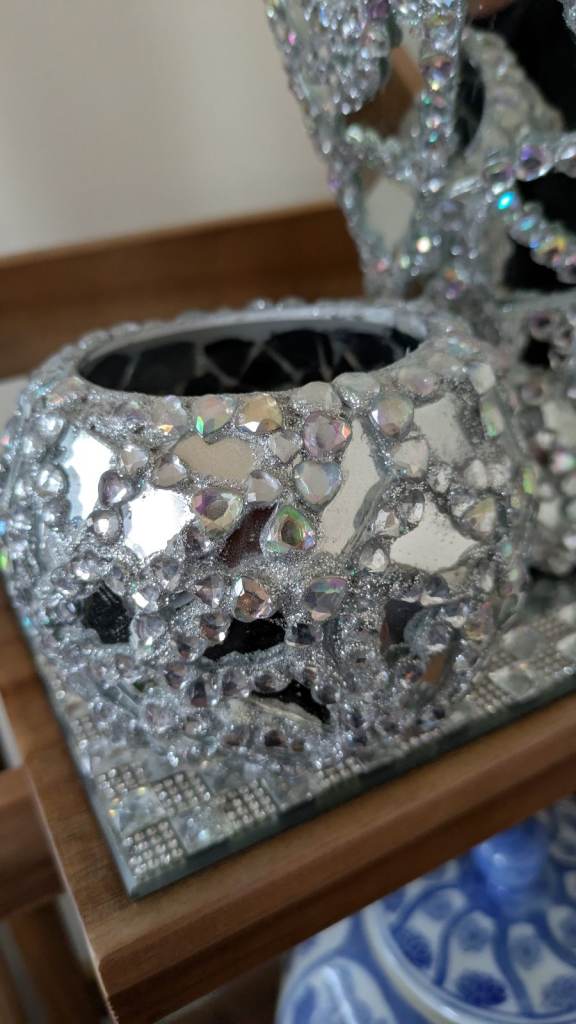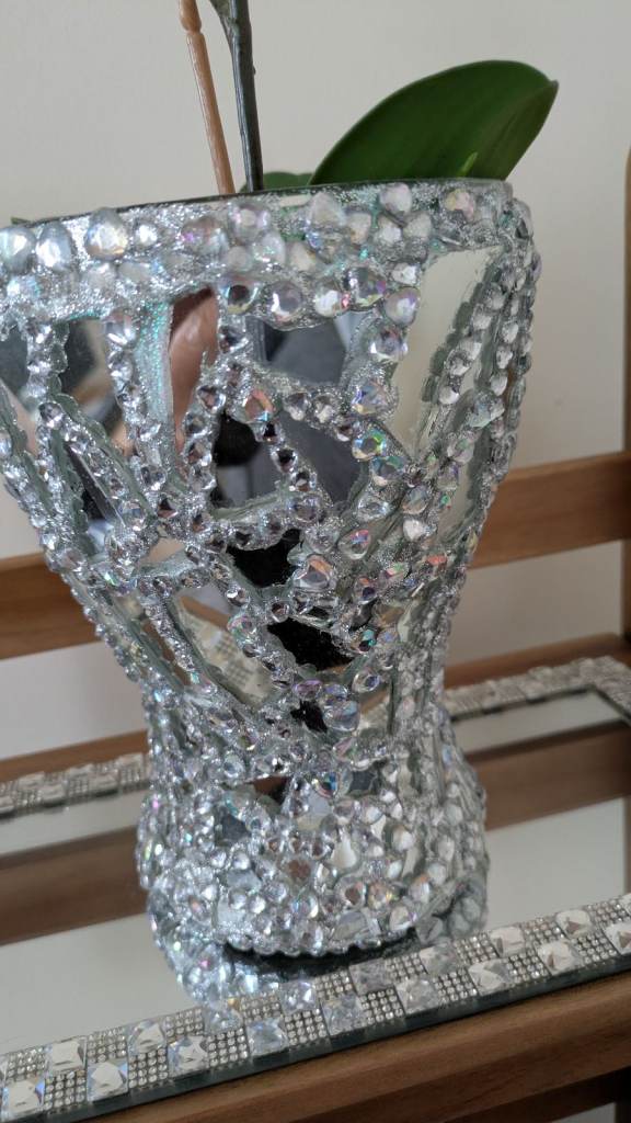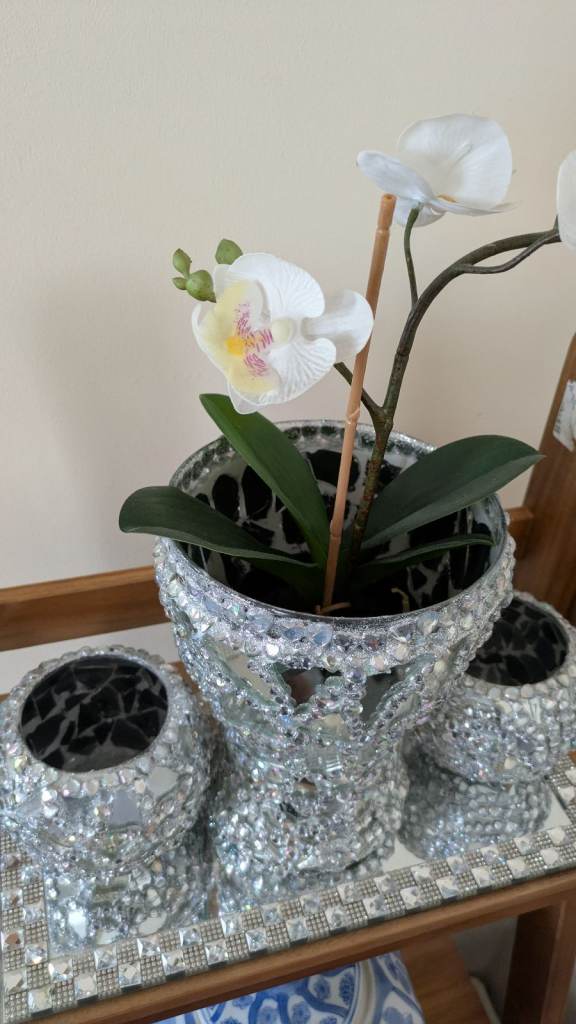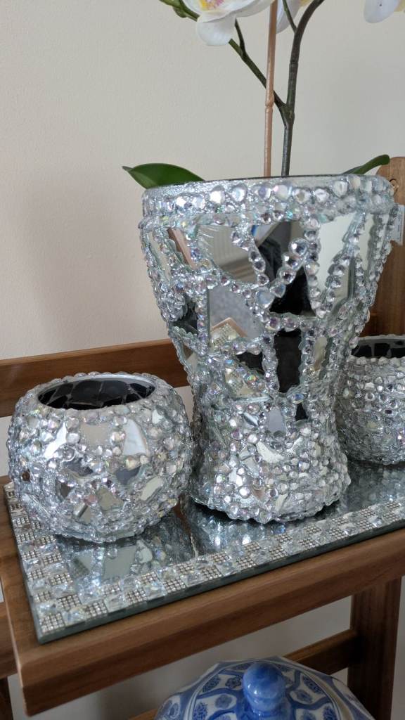 Glass mirror plant pot vase with artificial flowers, two mirror glass candle holders,a glass mirror tray. Vase candle holders are handcrafted sparkling very pretty. Excellent condition. Swansea sa16Hh collection only four items in total