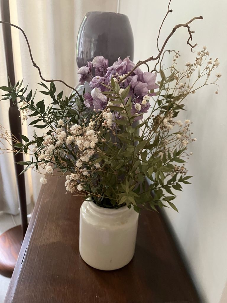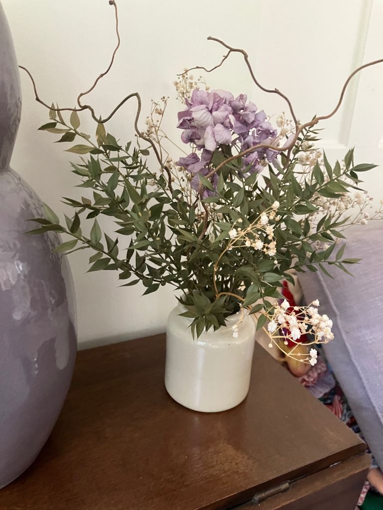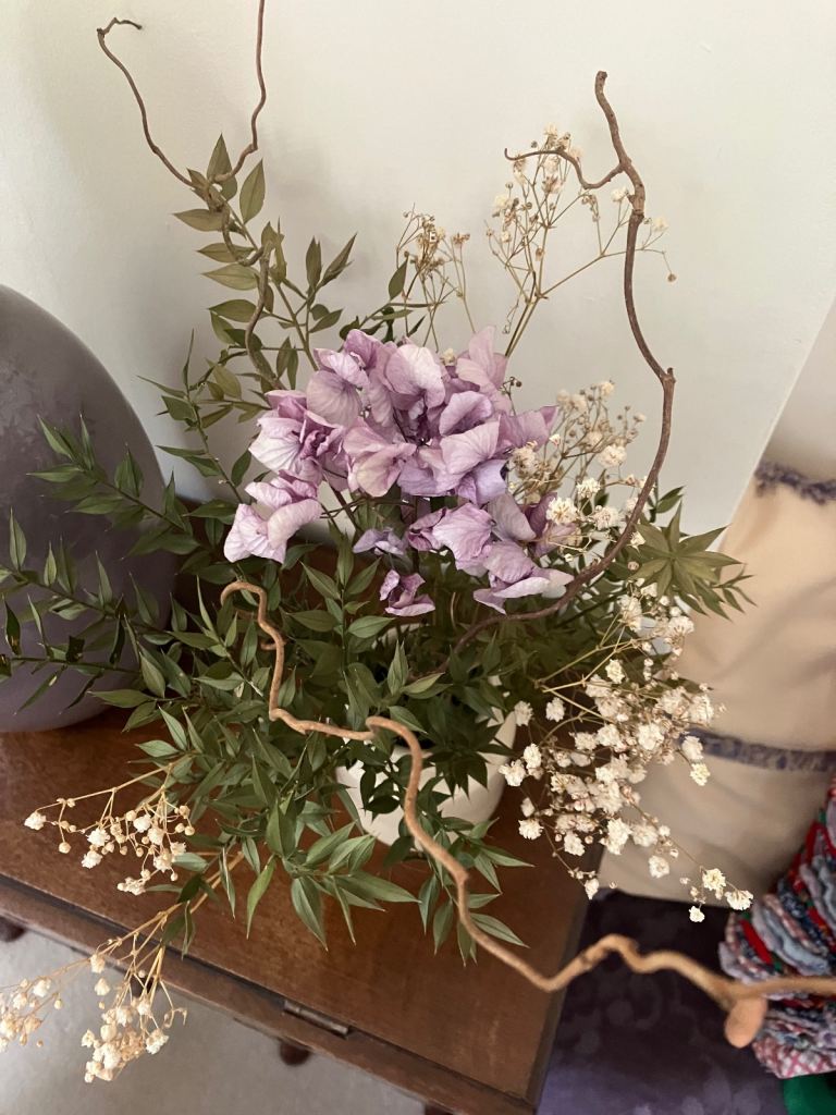 Dried flowers including Hydrangea and corkscrew hazel