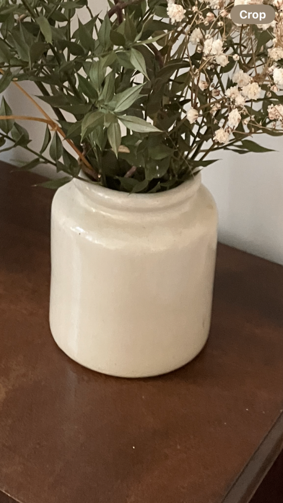 Small glazed pottery pot/vase with dried flowers. Collect Chichester