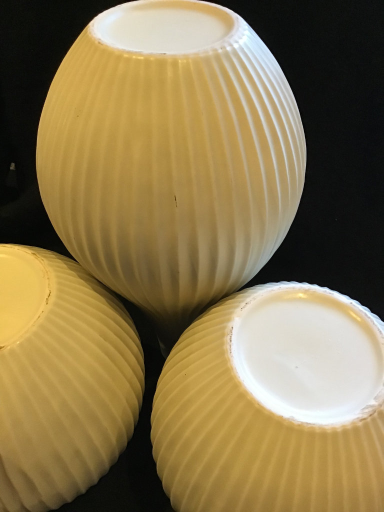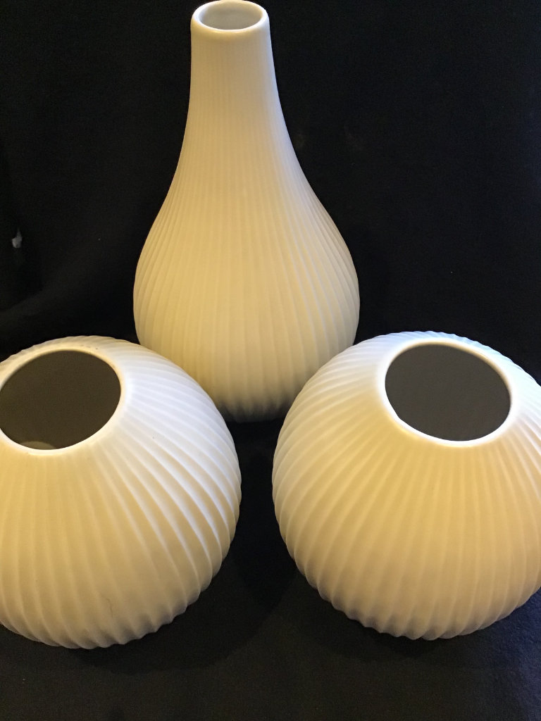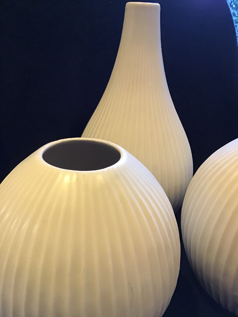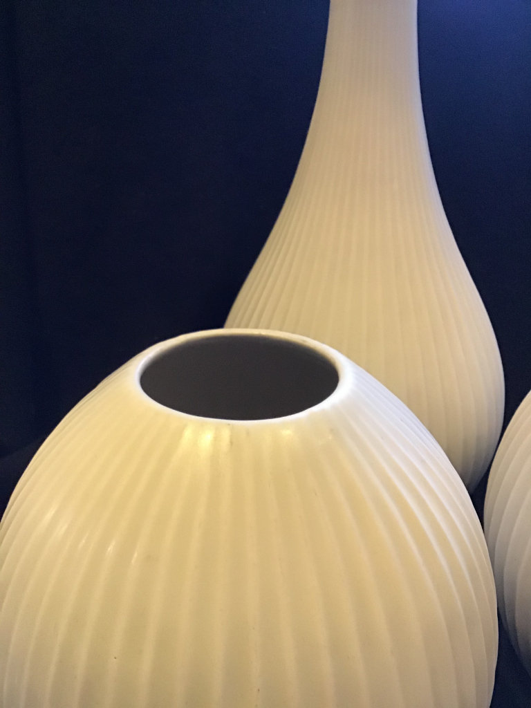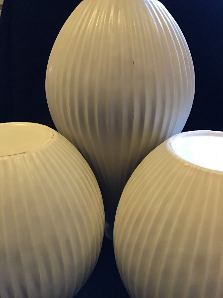 Three matching quality vases from John Lewis. The tallest is 14” tall. The other two are 9” tall with a Diameter of 8” around the Body. Ivory Glaze with a high profiled vertical rib design. Simple but very Chic costing £90 some considerable time ago.