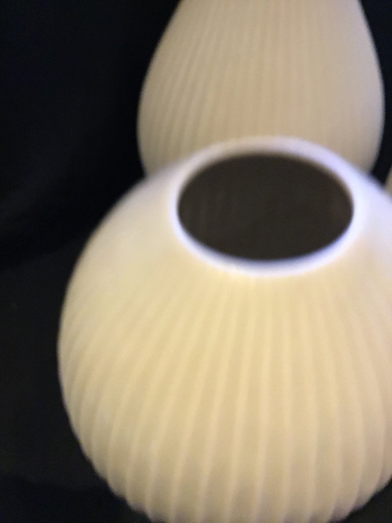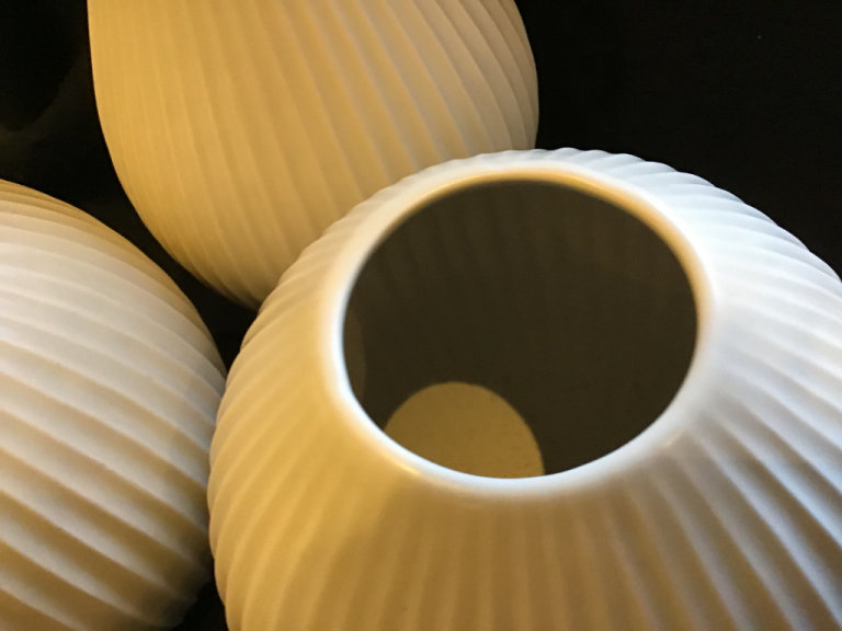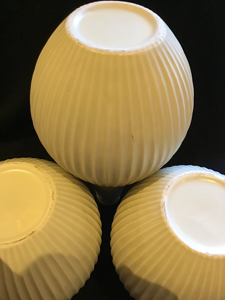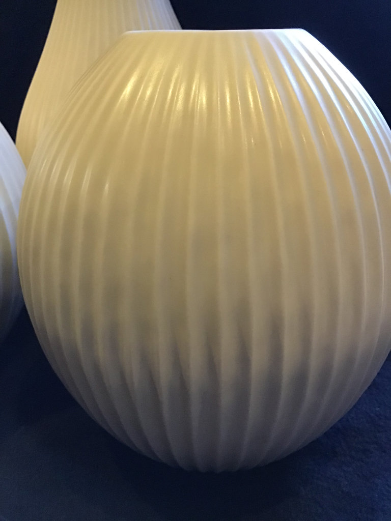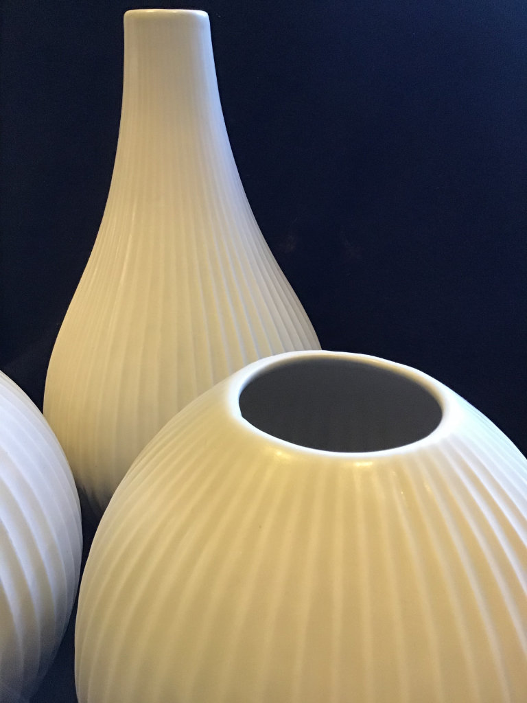 Three matching quality vases from John Lewis. The tallest is 14” tall. The other two are 9” tall with a Diameter of 8” around the Body. Ivory Glaze with a high profiled vertical rib design. Simple but very Chic costing £90 some considerable time ago.
