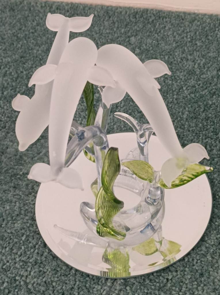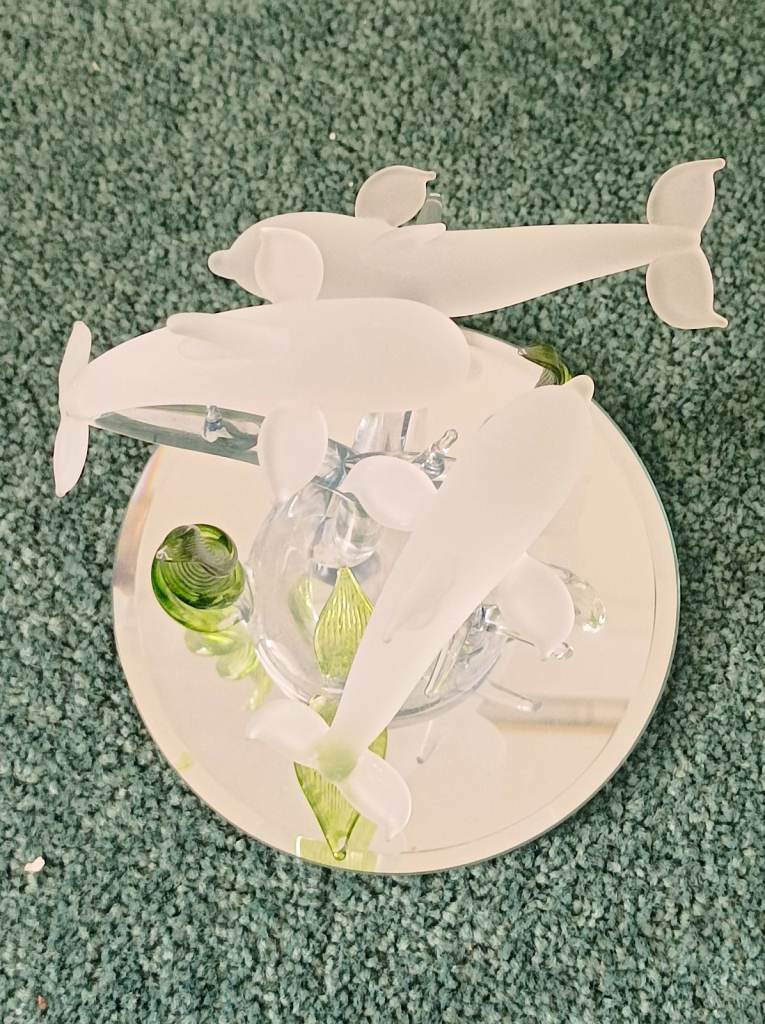 These beautiful ornaments are hand blown glass animals. Both on mirrored glass bases. One is of playing dolphins, and one is of two swans with two birds.