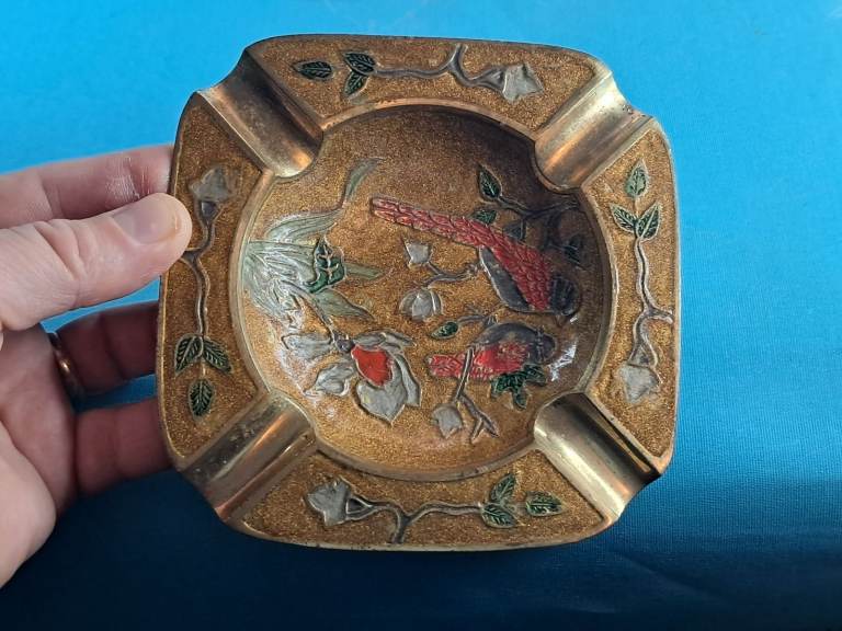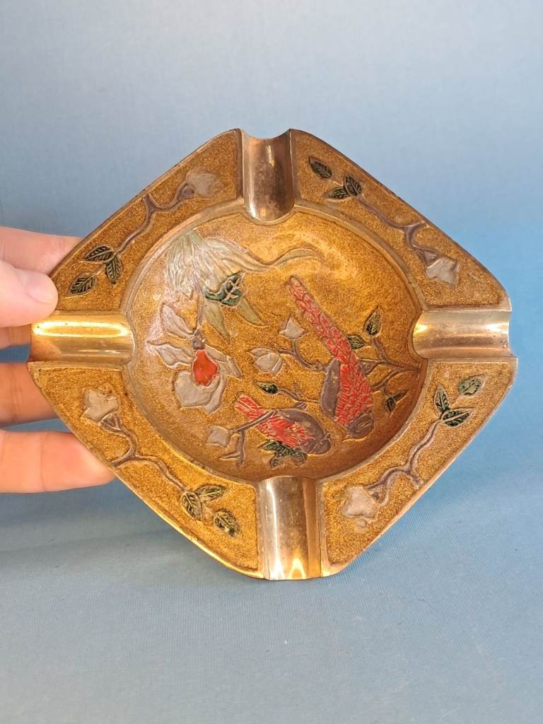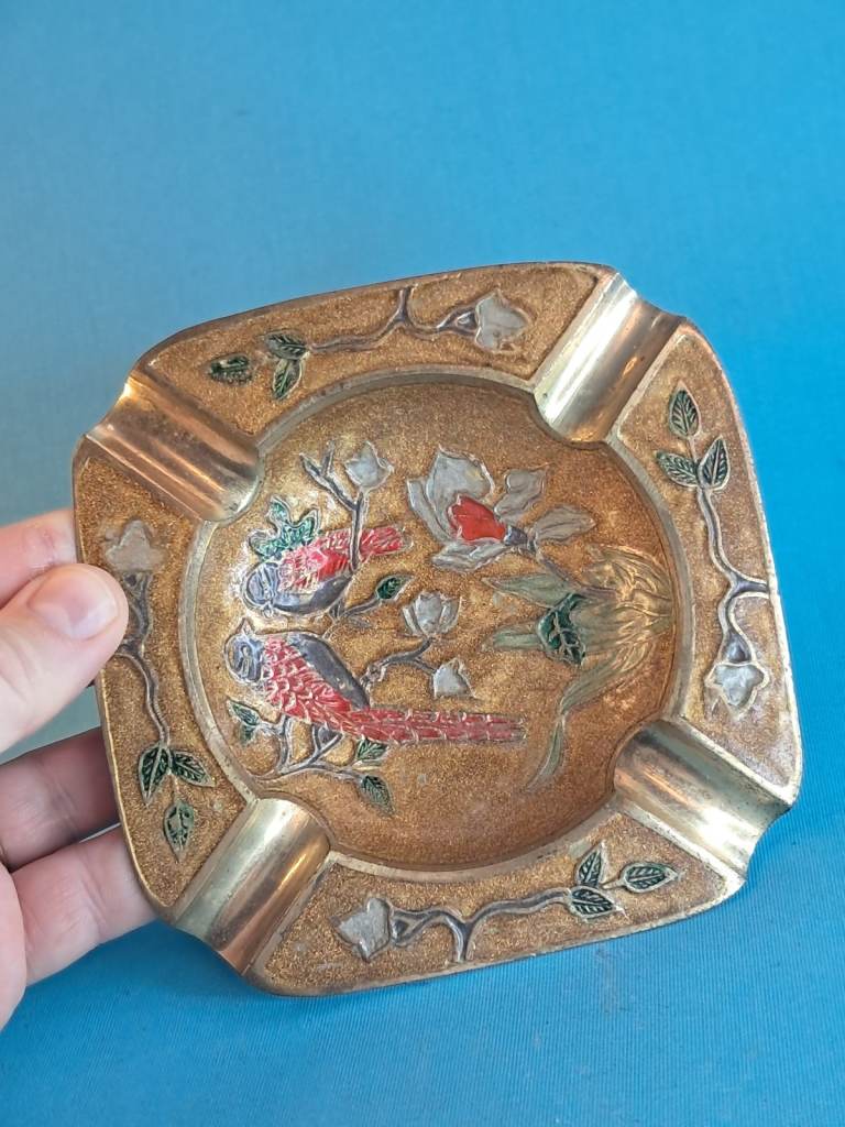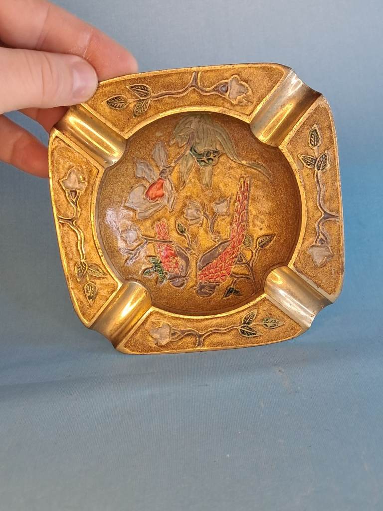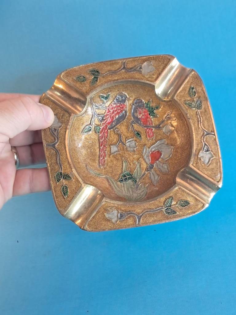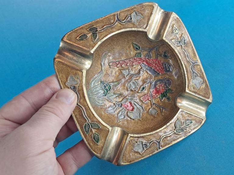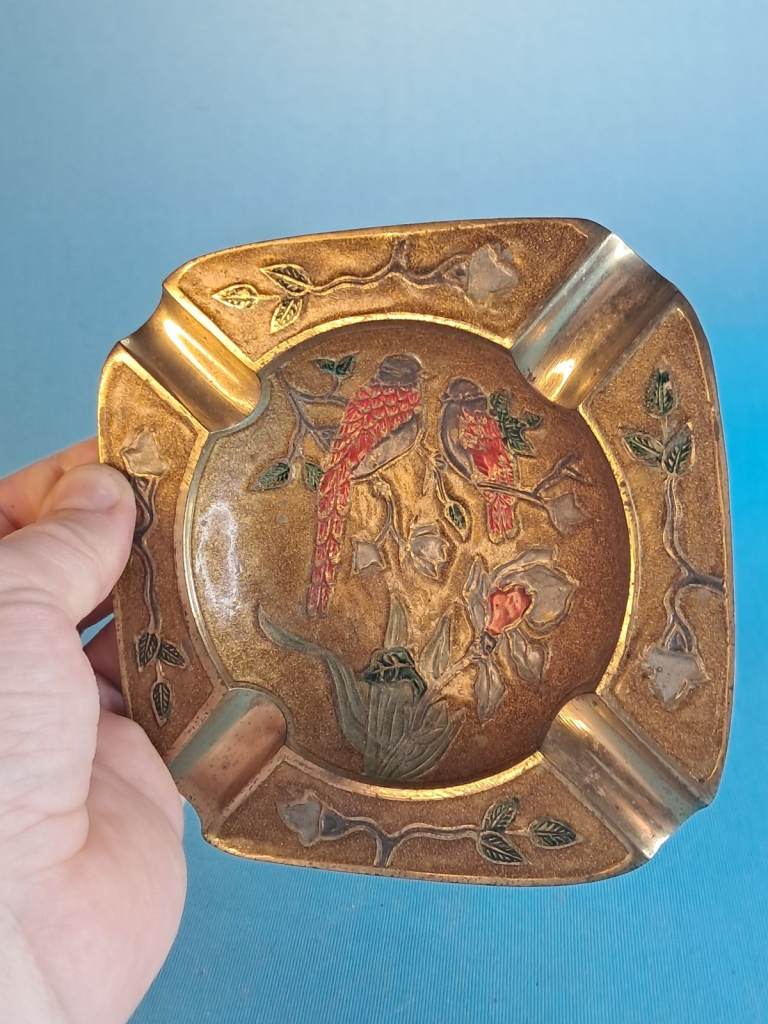 Vintage brass ashtray,from the early to mid-20th century,featuring design of birds and flowers