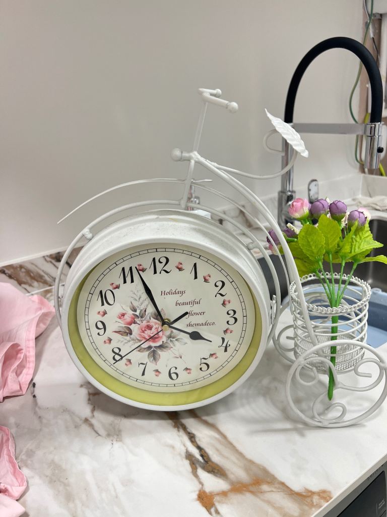 The clock designed in the shape of an old-fashioned bicycle. The clock face is round, with a floral pattern featuring pink roses, Roman numerals, and the words “Holidays beautiful flower shemadeco.” The bicycle frame is made of white metal, with curved details, a decorative leaf near the handlebars, and a small basket at the back holding artificial flowers in shades of pink and purple. The entire setup is placed on a marble countertop near a sink, with a soft pink fabric draped beside it. The hands on the clock display different times in each image.