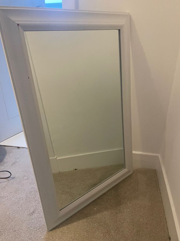 This White Framed Mirror is a modern and sleek addition to any room in your home. The rectangle-shaped mirror features a mirrored frame finish, making it perfect for wall mounting. Made of plywood/mdf in the United Kingdom, this white-framed mirror is a stylish and practical choice for adding a touch of elegance to your living space.