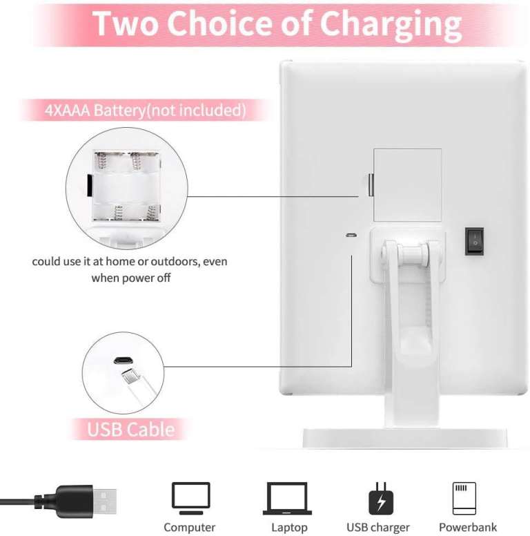 TOUCH SCREEN & DUAL POWER SYSE: You could turn ON/OFF the Makeup Table Mirror by touching the Sensor button. Long press to dim the brightness as you need. The Vanity Mirror supports USB charging and 4 AAA battery powered. It is very convenient and portable, ideal for travel.
