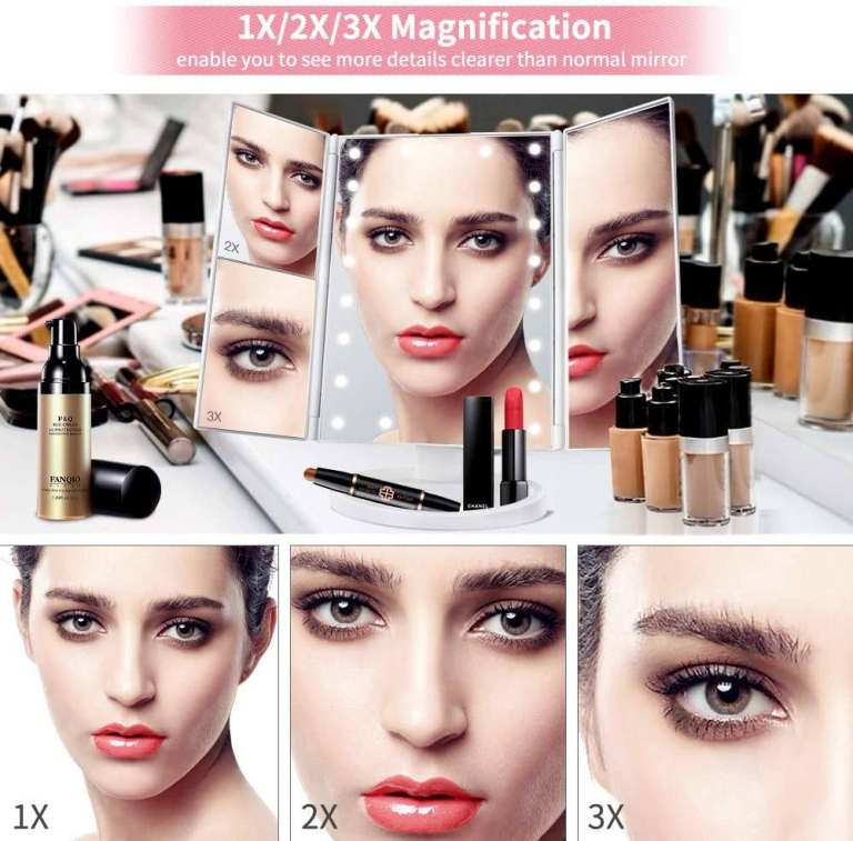 POWERFUL 3X2X1 MAGNIFICATION: 3 panels have 3X/2X/1X magnification function individually, which allows you to focus on a specific section of your face, ideal for applying eye makeup, details of eyeliner, eyebrows, and grooming of unwanted hairs; it will help ensure you're always ready.