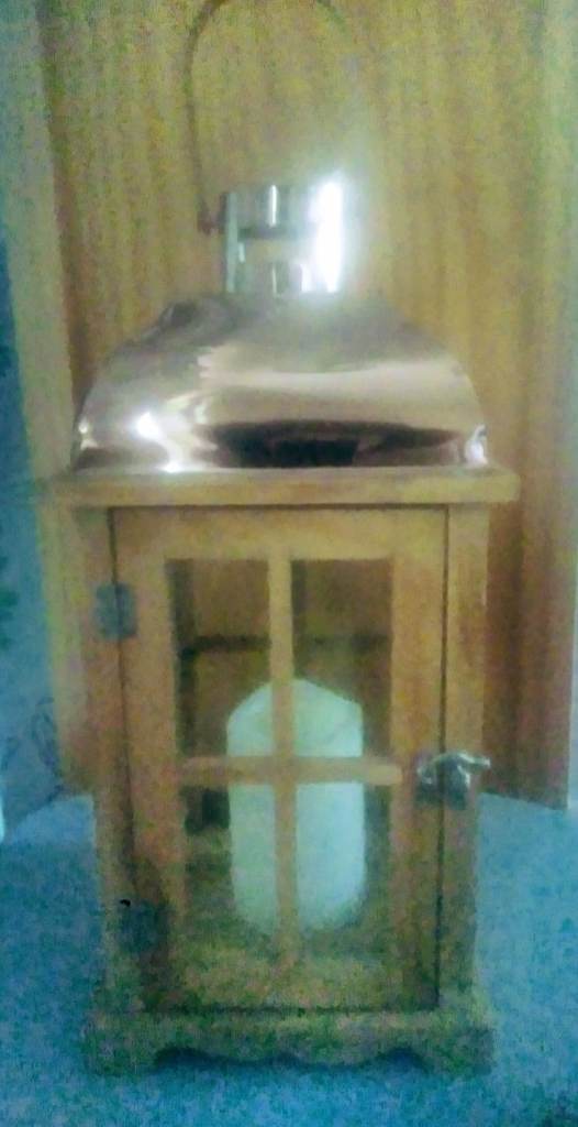 Wood lantern with copper top, measures approximately 40cm high x 9cm square. Battery powered candle requires 3 x AAA batteries. Can deliver in area
