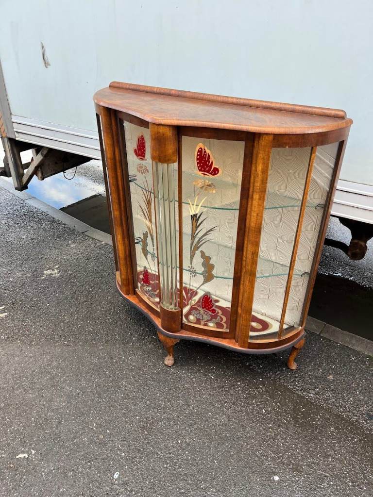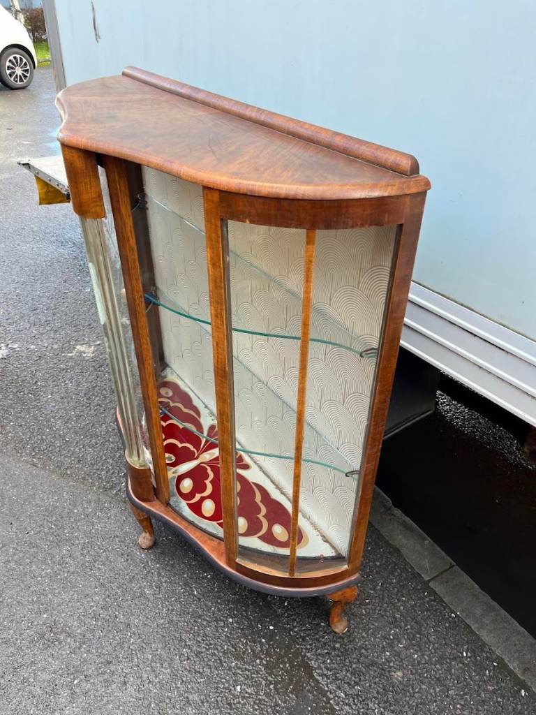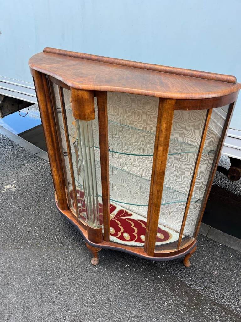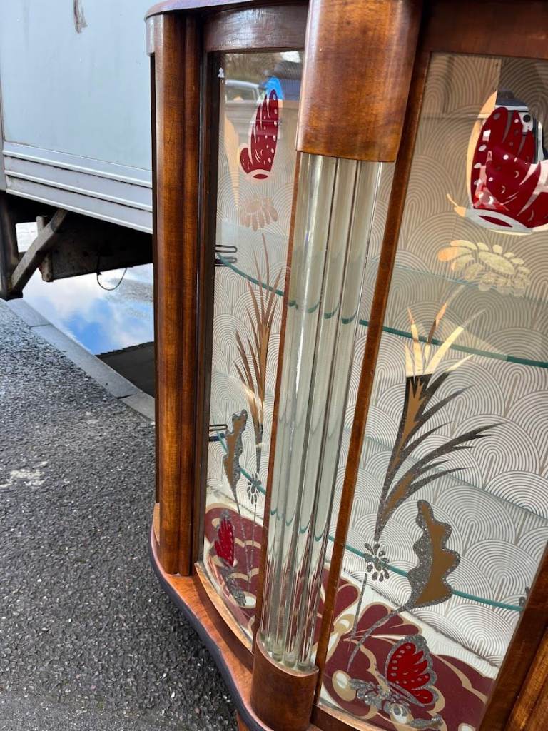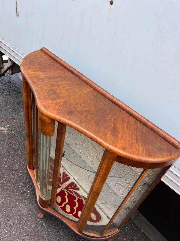 Art Deco display cabinet with curved glass front, central tubular glass column, butterfly-patterned interior and cabriole legs. Decorative piece with light age-related wear.
