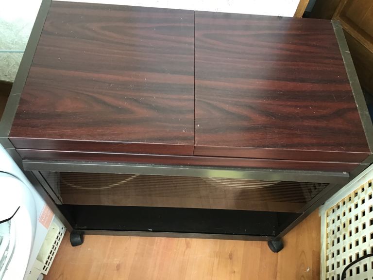 This hostes trolley tucks away in the kitchen, it is on wheels and plugs into the mains, before serving food just put the meals , potatoes, meats, soups, veg into the containers and the food will stay hot, the lip slides left and right and the 2 segments open to reveal the food containers, the trolley is in brown wood effect and works fine. If you run a busy kitchen and need to use all of your cooker and you run out of pans you can store the food in the trolley