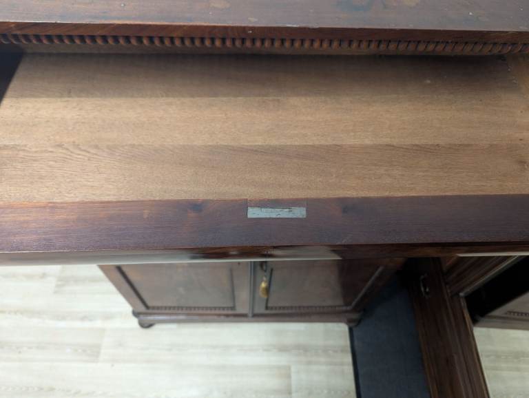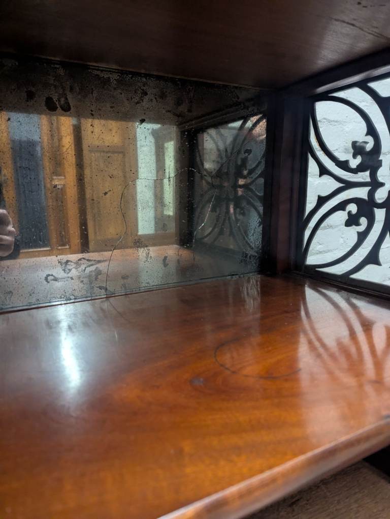 Great condition overall however the mirror is cracked and delivered silvering in areas and some small parts of the moulding are either missing or glued back on.