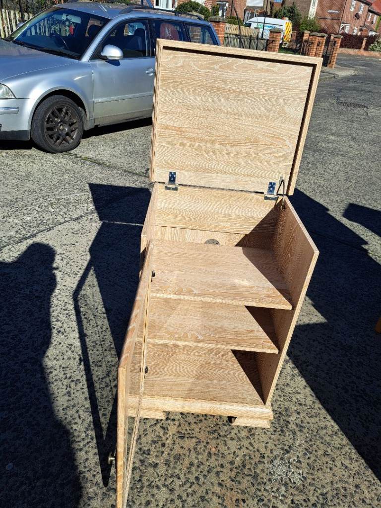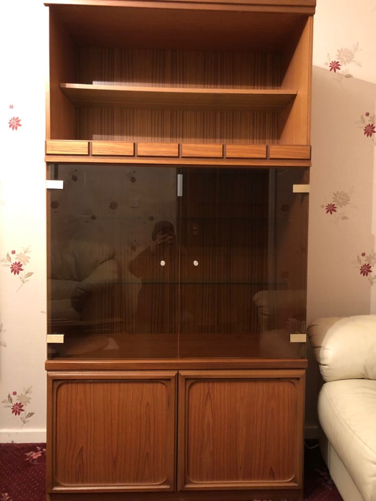 2 shelve light wood unit with glass door and lift up top in canny condition please ring or text me for more details please take a look at my other items thanks no offers