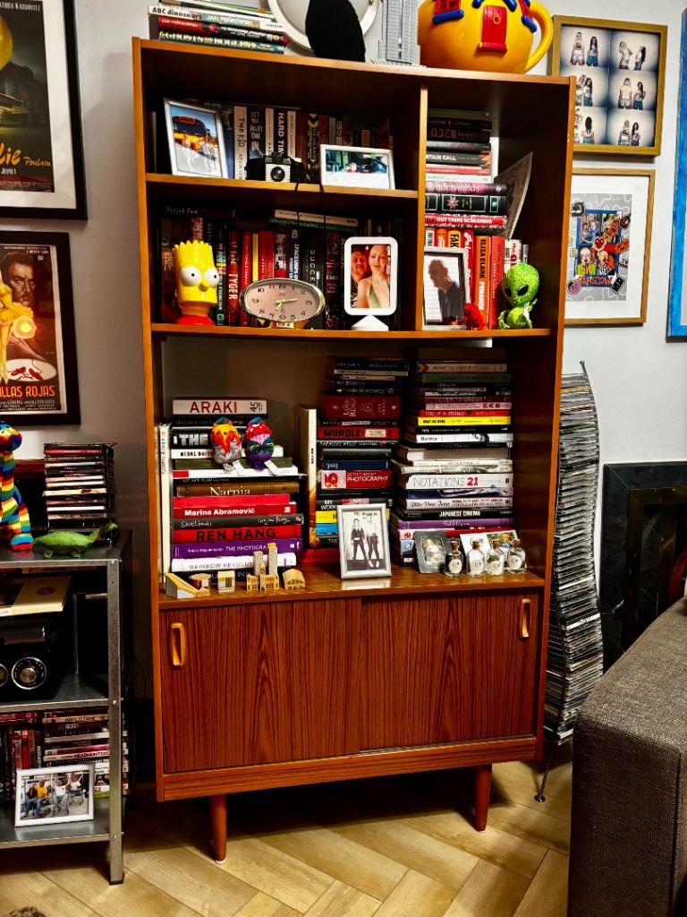2 shelve light wood unit with glass door and lift up top