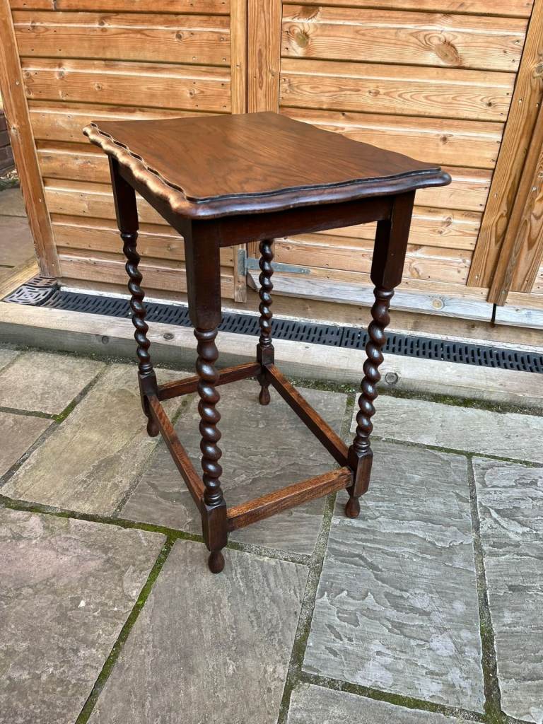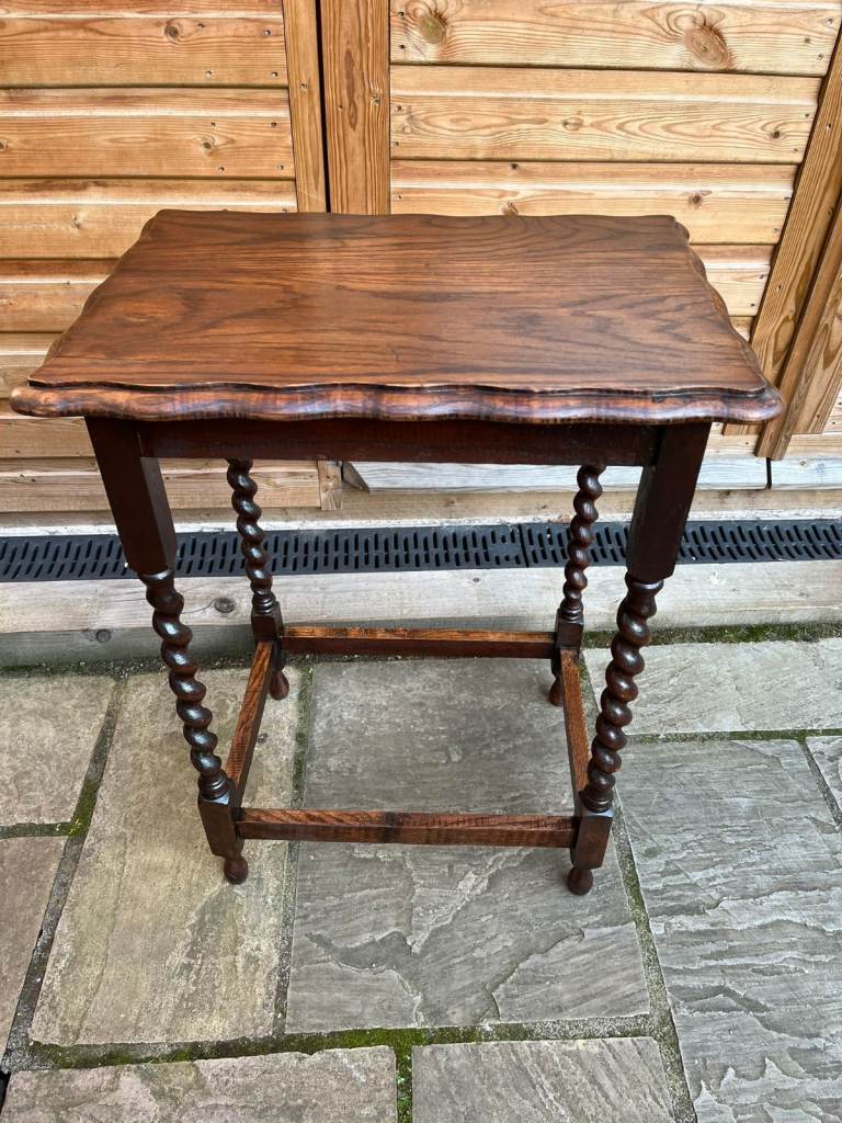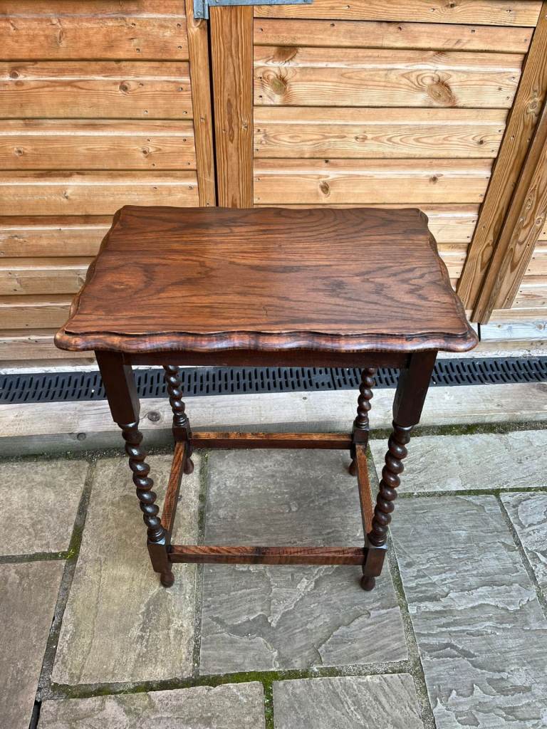 This is a small oak side table which stands on four attractive barley twist legs and which has a rectangular top with a nicely shaped perimeter. Its top measures 57 cm x 40 cm and the table is 72 cm high.