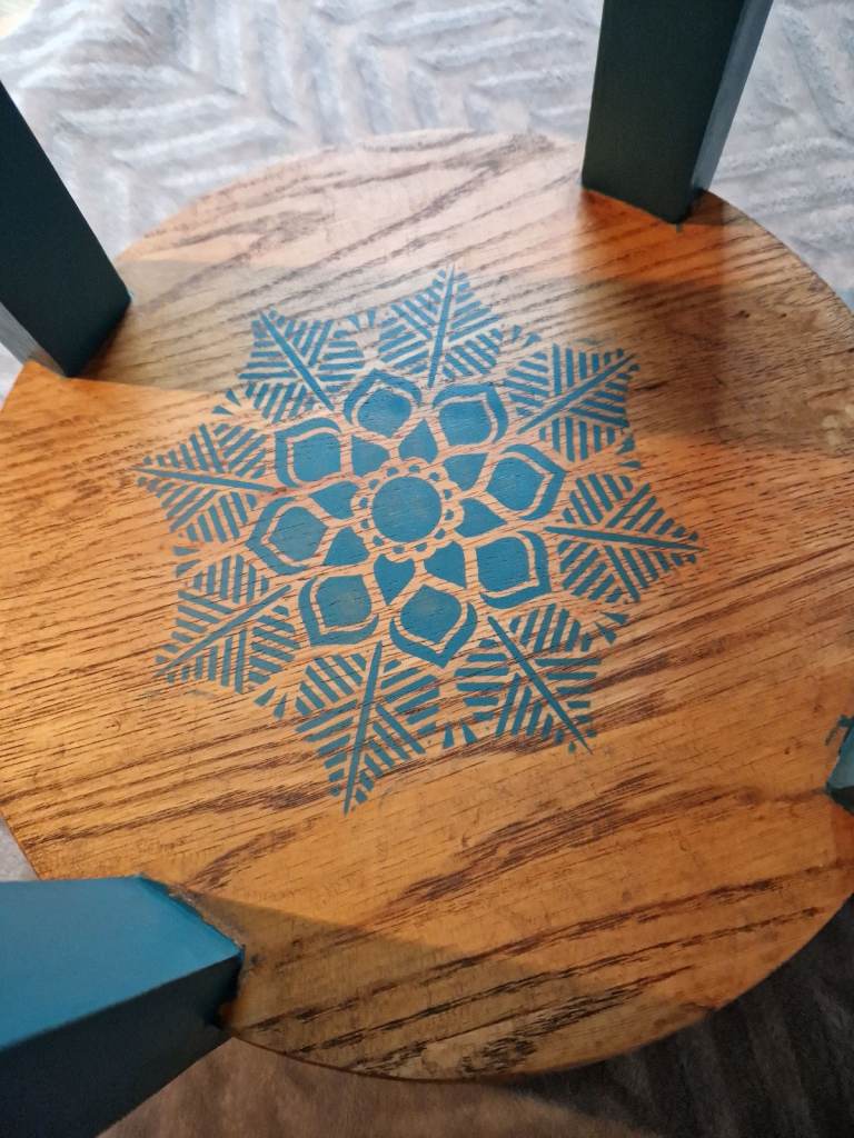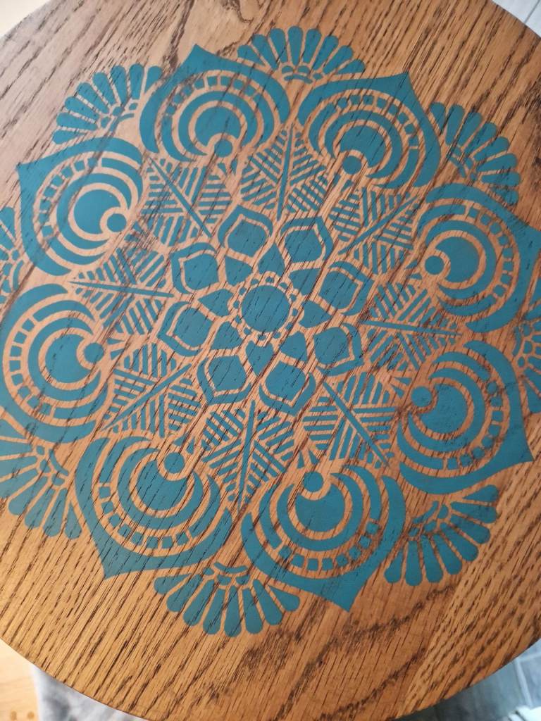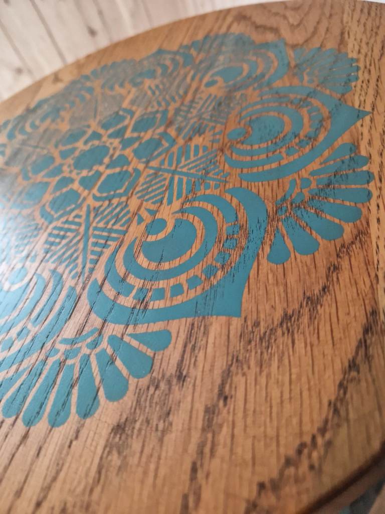 Stunning colour to complement the dark wood finished with a mandela stencil and furniture wax.