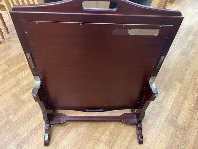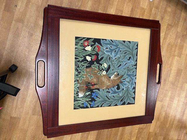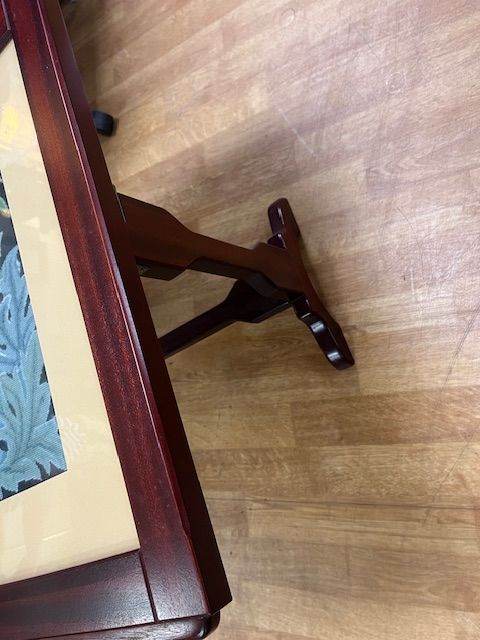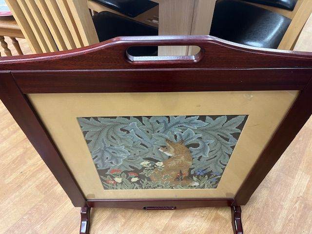 Inlaid with a tapestry fox design this beautiful retractable coffee table is in dark wood. Really weighty item and so well made.