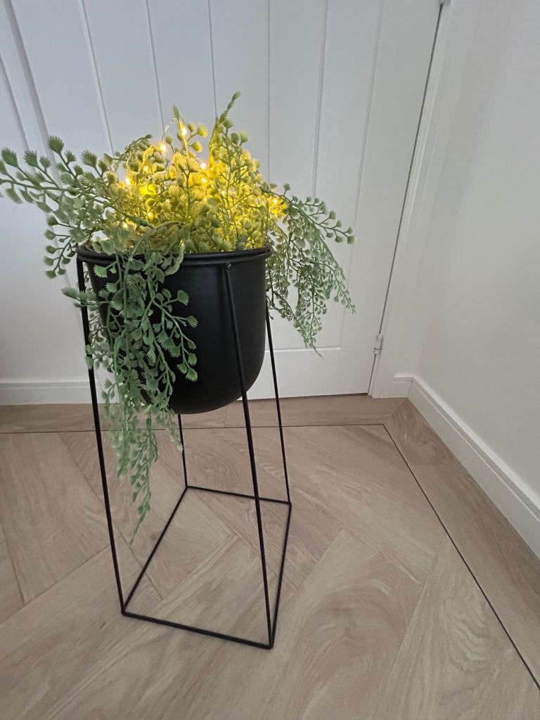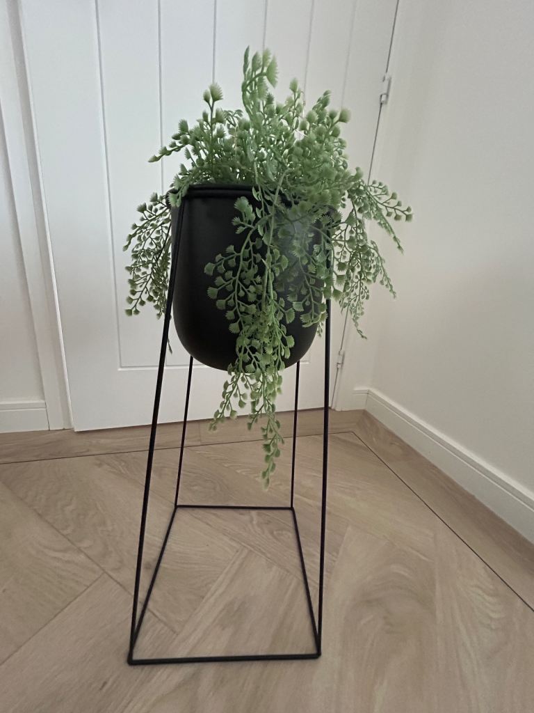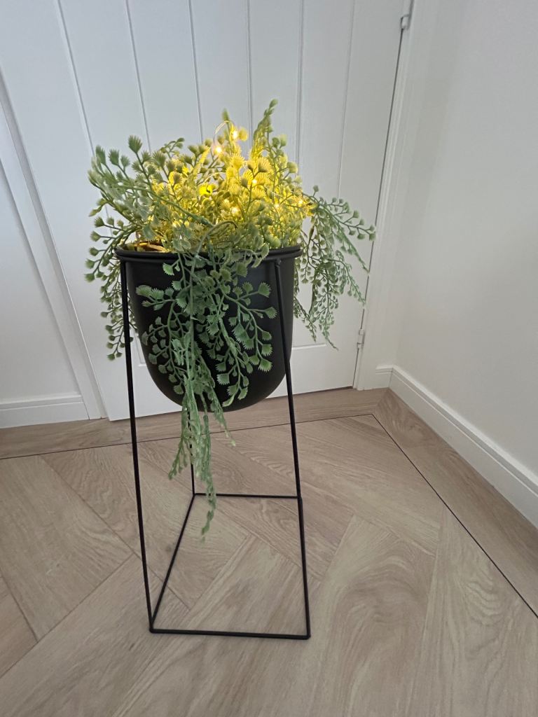 Black stand with pot filled with artificial foliage.