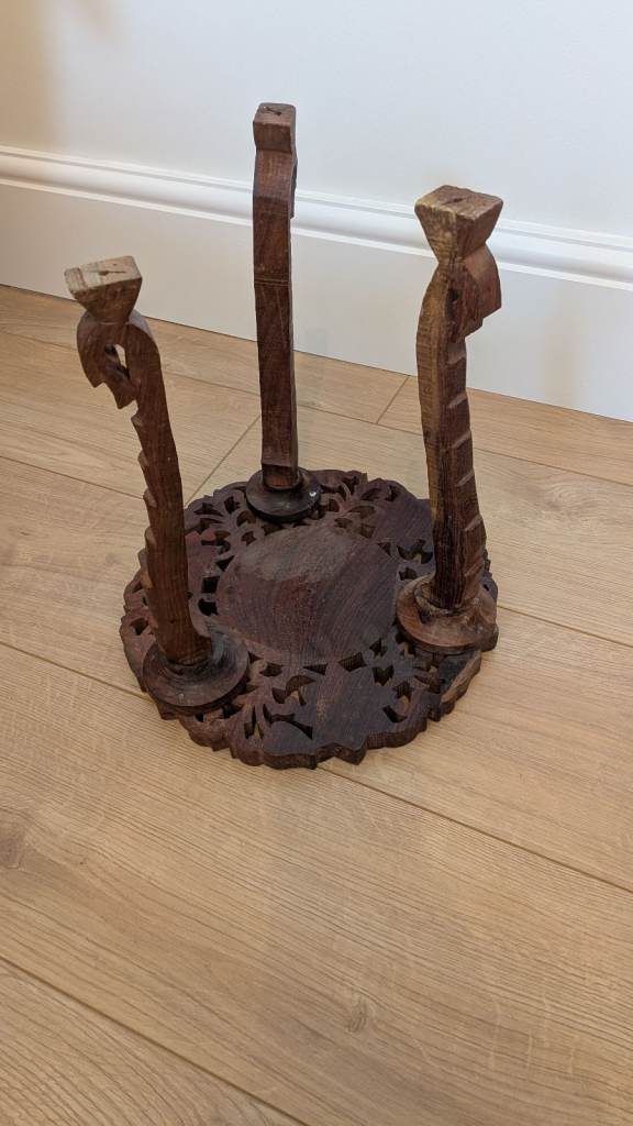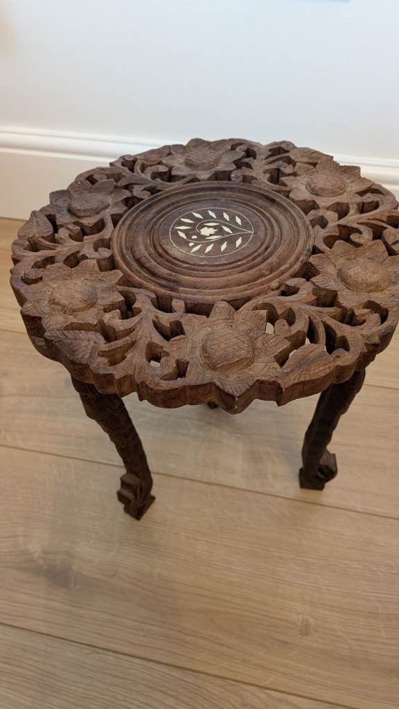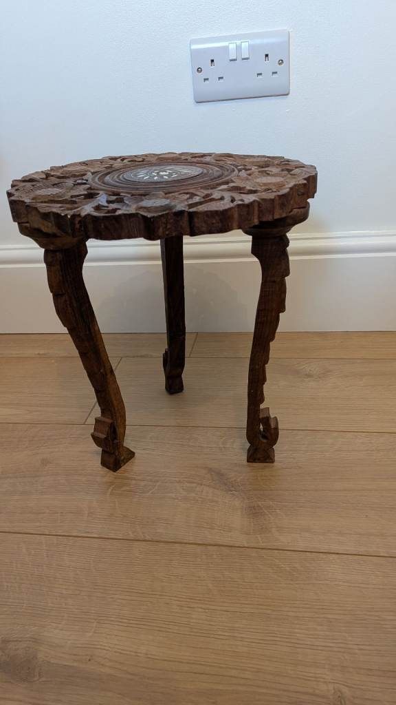 Unusual mini, carved wooden table. Bought at an antique store to pop my old Christmas tree on.
