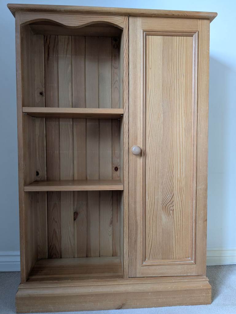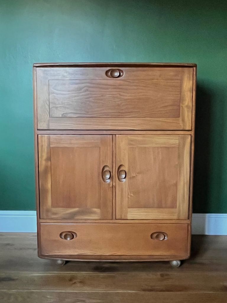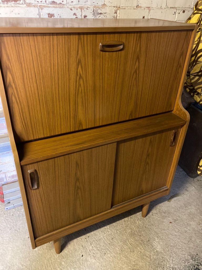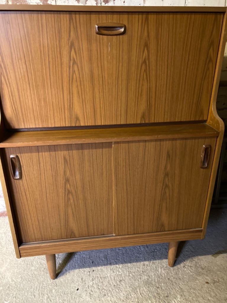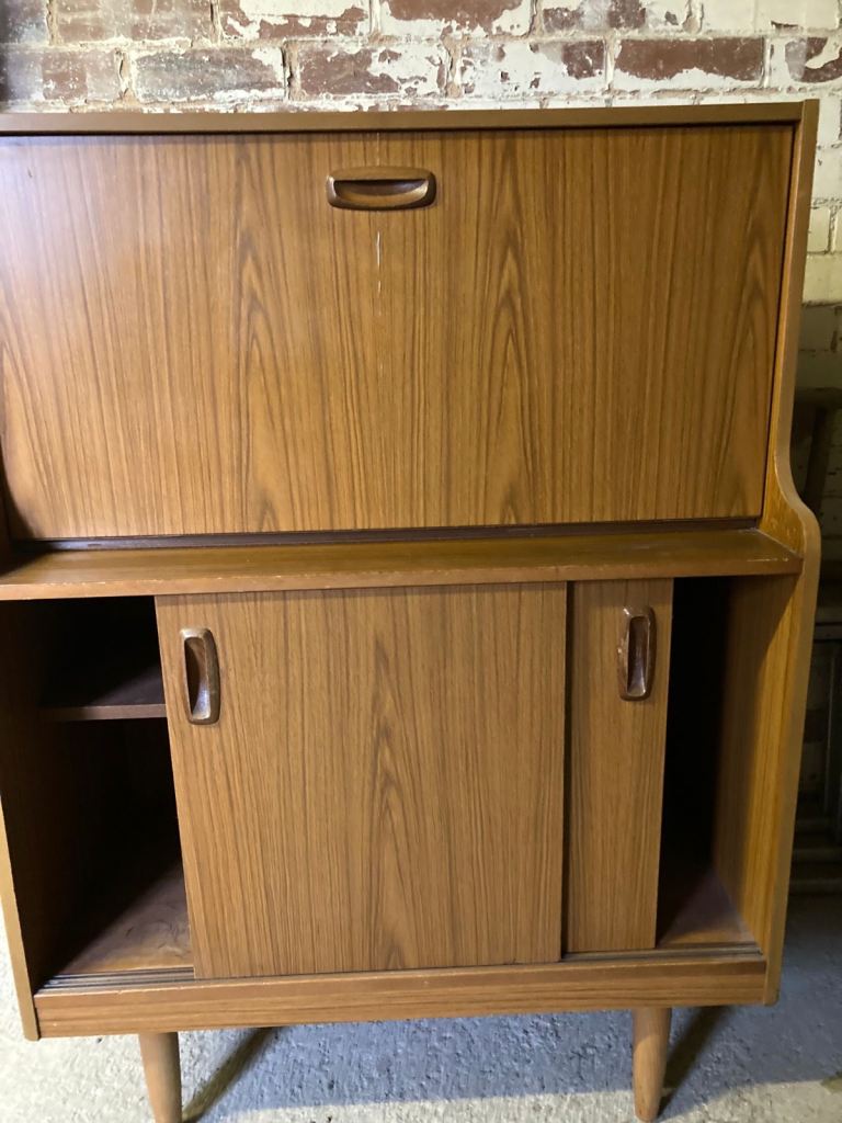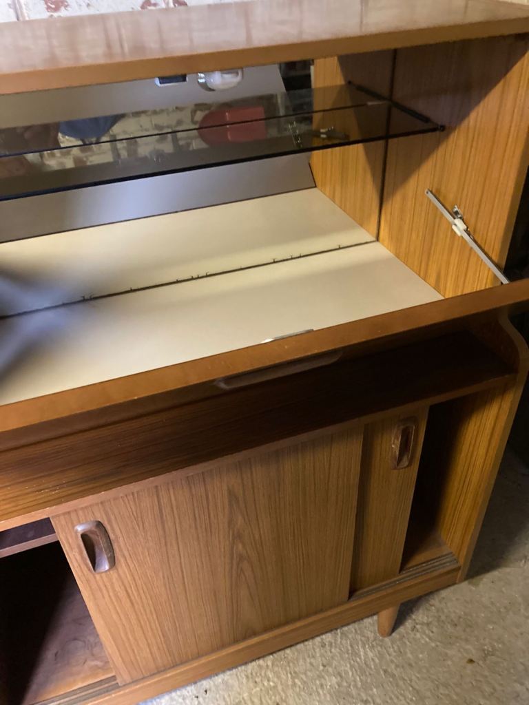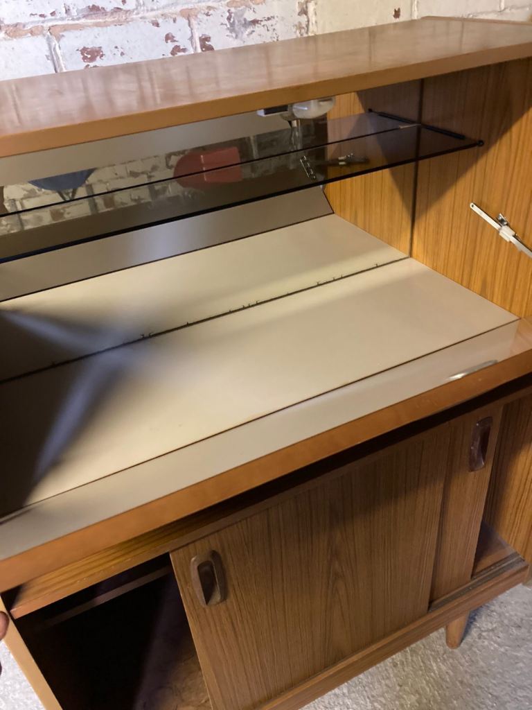 Pull down cupboard with mirrored back and 2x cupboard below with shelf