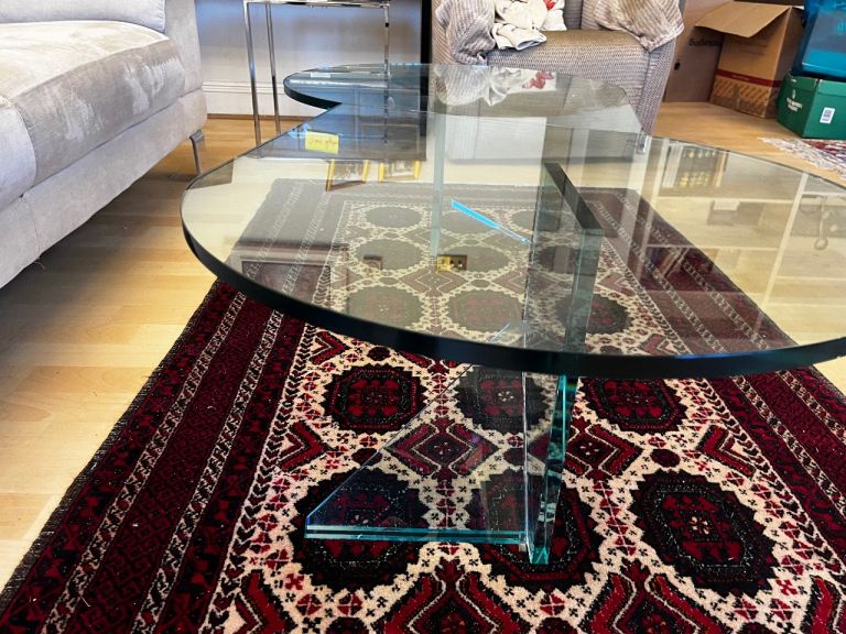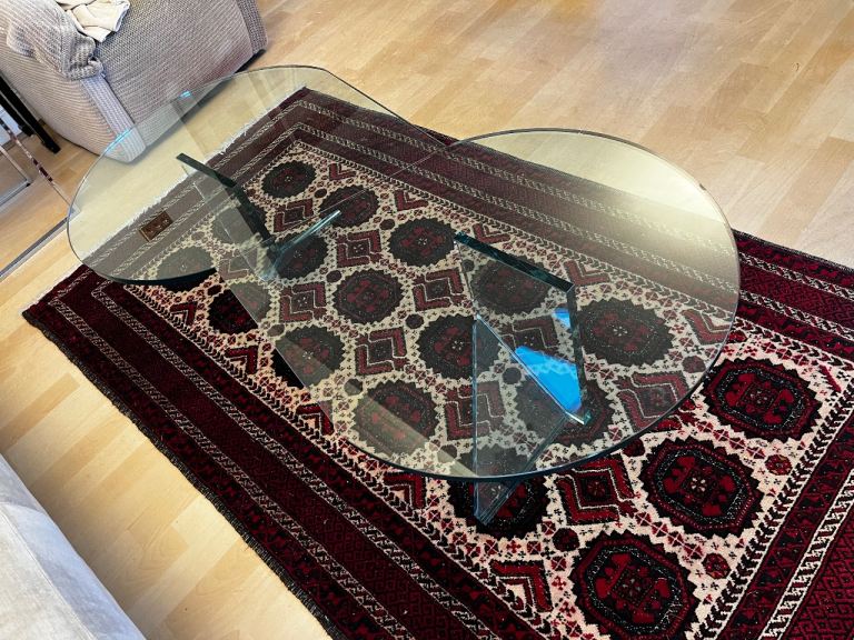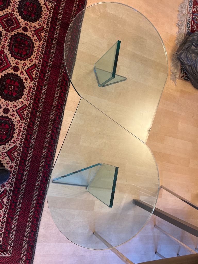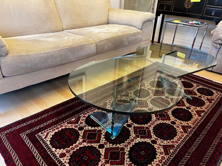 Coffee table thick glass, double teardrop shape.