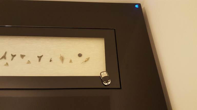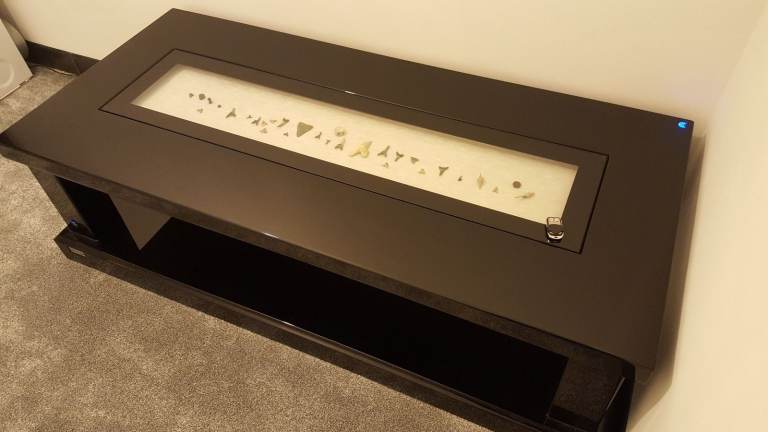 You can display coins,fossils,antiques up to approx 1 inch in height. The table is still boxed/crated so not easy to take pics. The table for sale is the first pic .... the rest are of the table I'm keeping.... they are very similar apart from the display depth.