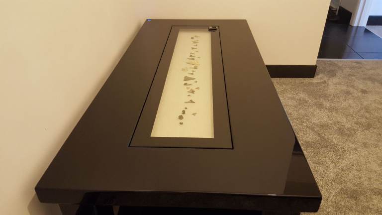 Bespoke brand new coffee table. only 2 exist and I'm keeping one of them. Remote control lighting...usb charging port... stainless steel laser etched name plate and serial number. Table name is THE SOVEREIGN.....serial number 200883. grab yourself a unique bargain. Approx 28 inches x 60 inches x 18 inches tall.