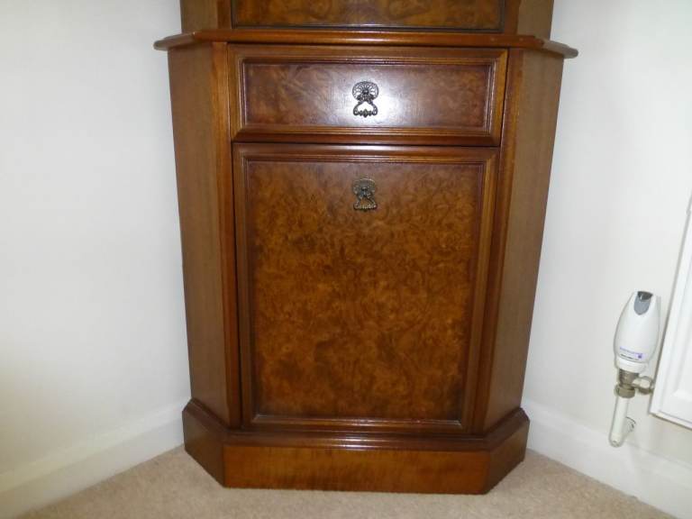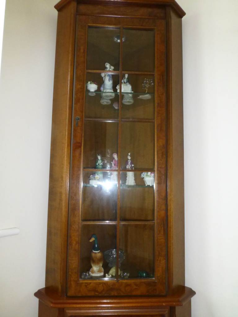 Lovely wood corner display cabinet with lighting and glass shelves. Top display unit can be detached from base unit for transport. Items shown in cabinet not included in sale.