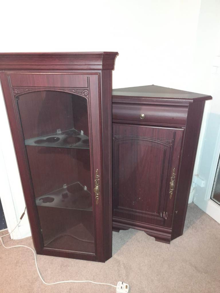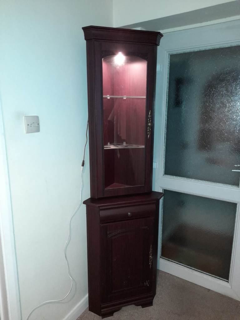 Mahogany corner display unit. Comes in 2 parts and has a light in top half. Can be attached together with screws. A few minor scratches on it from wear and tear. Also a mark from tape that was used to keep closed whilst in storage.