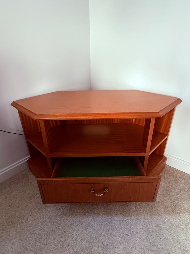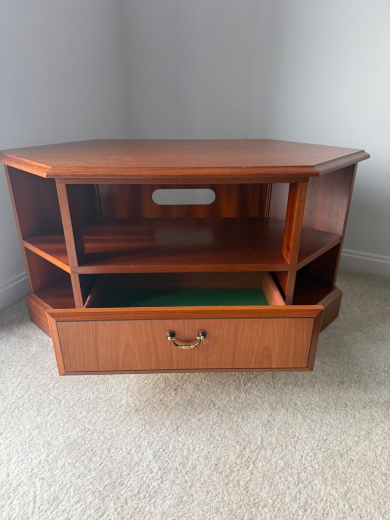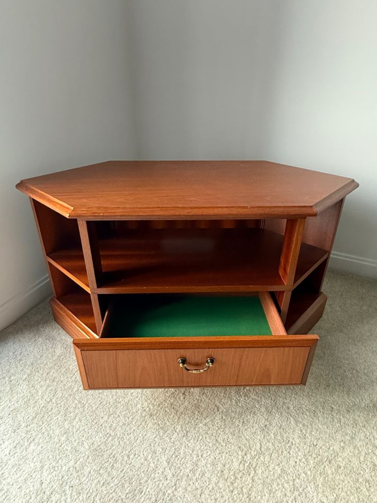 Matching pair of corner display units in a warm medium-wood finish with brass-tone drawer handles. Both are sturdy and well made, with open shelving and a lower drawer lined in green felt.