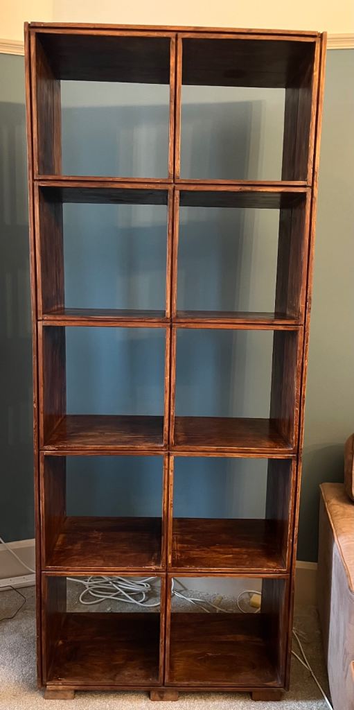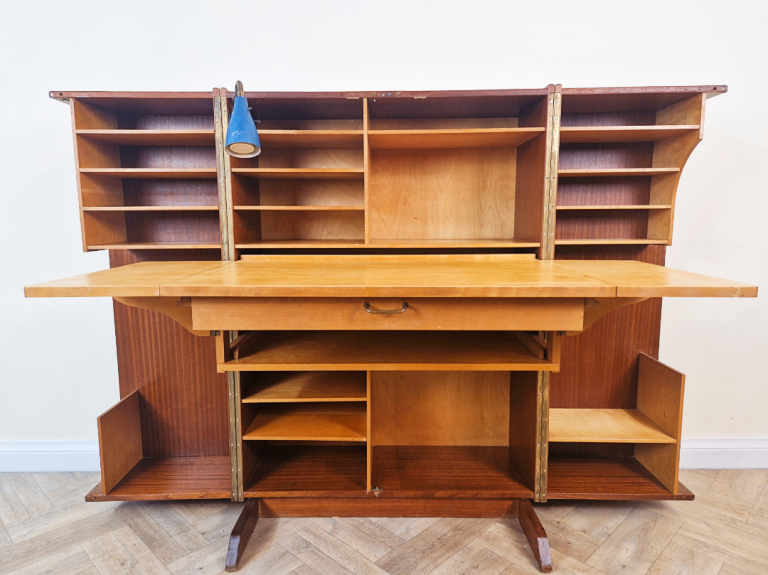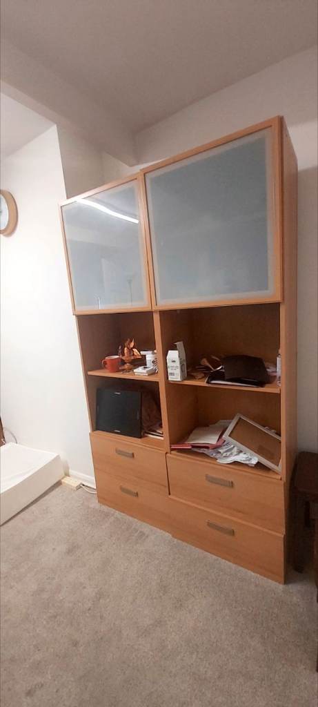 Features three drawers and three cupboards in the base, with two shelves above.