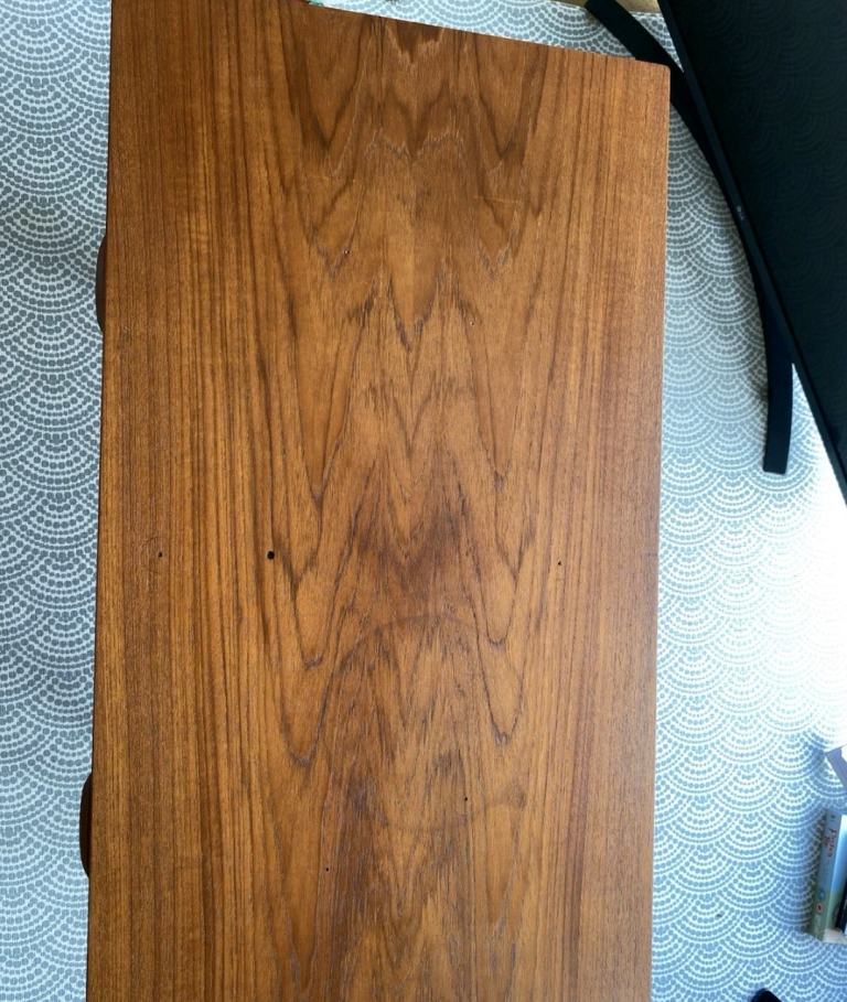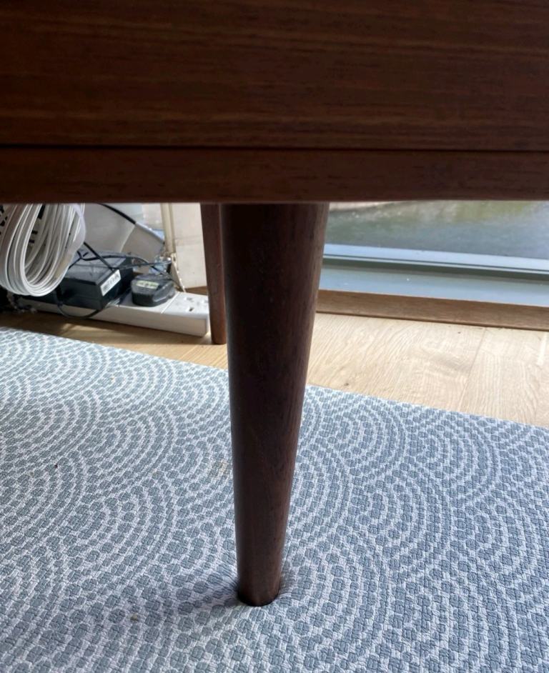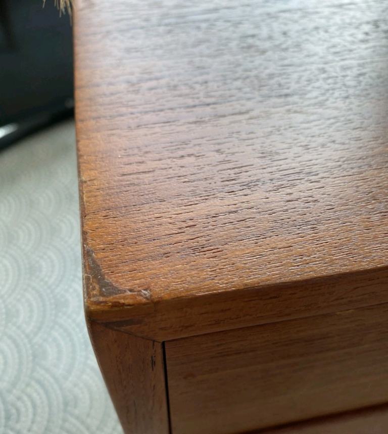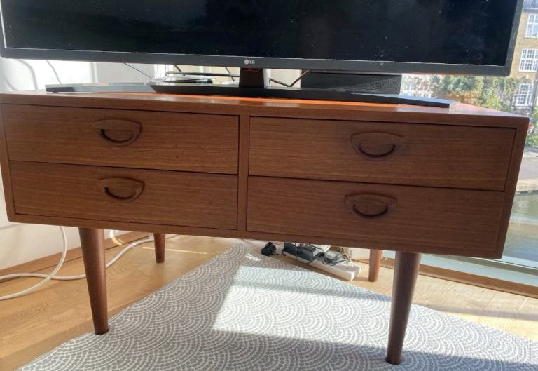 It features Kai Kristiansen’s signature carved “eye” pulls, elegant tapered legs, and beautiful dovetail joints. Teak grain runs throughout.