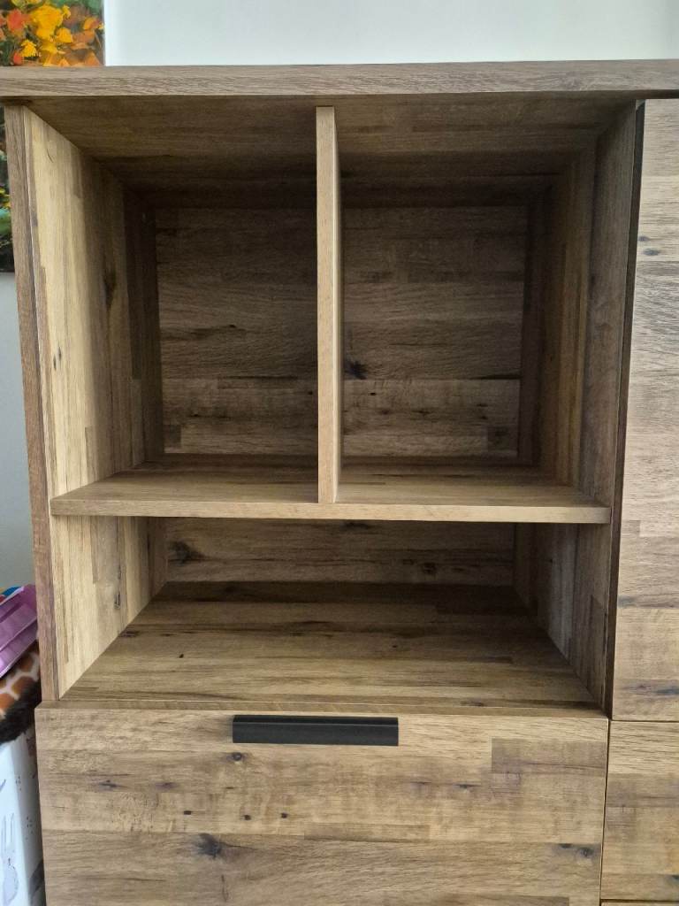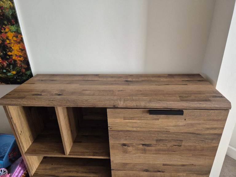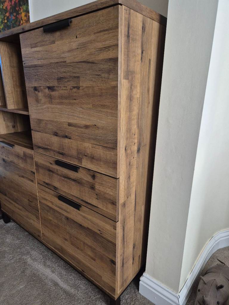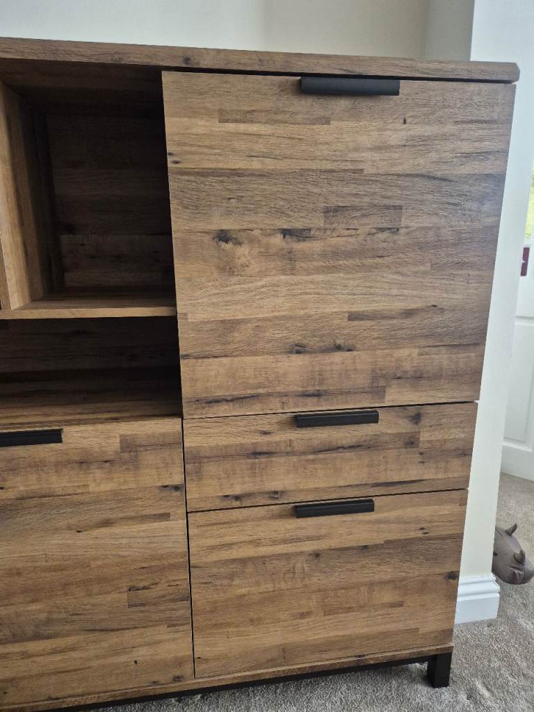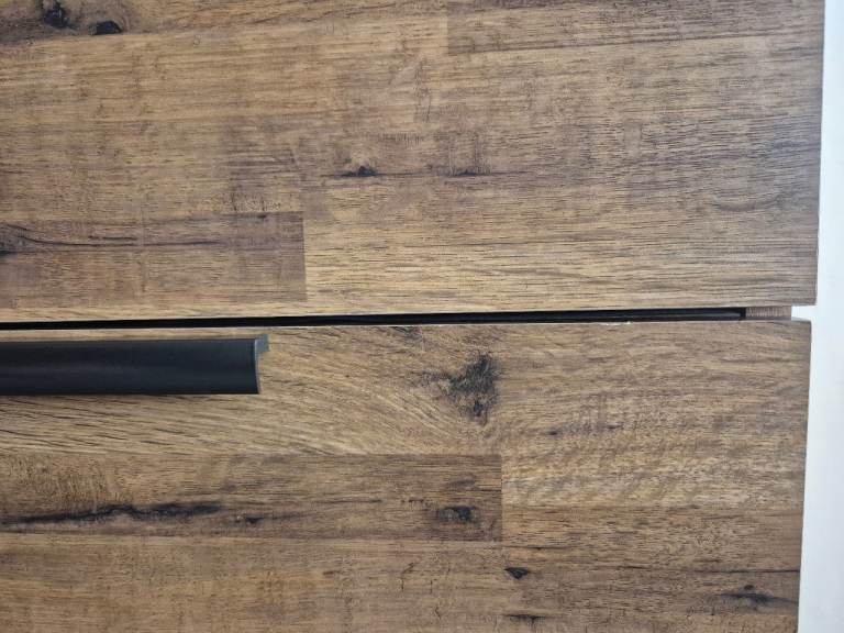 Dark Oak Effect Cabinet, rustic oak effect with dark metal handles. In very good condition with one slight scratch on the top drawer (as per photo) and hardly noticeable.