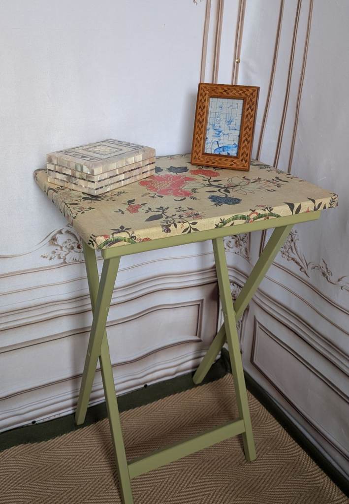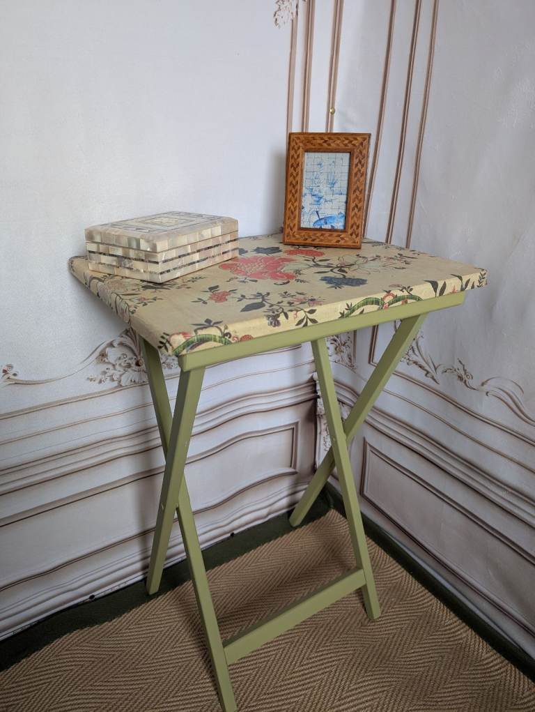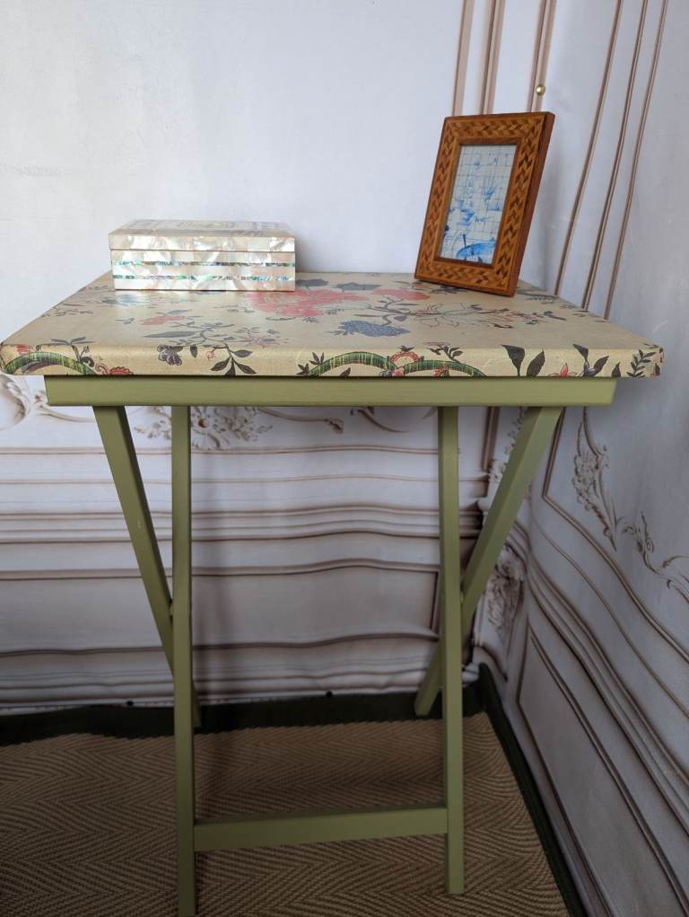 A very useful folding side table with base finished in high quality matte pale green and the top with a floral découpage. Folds flat for easy storage or moving. Available for easy to reach collection in Heworth area of York. Sorry, no offers. Smoke free home