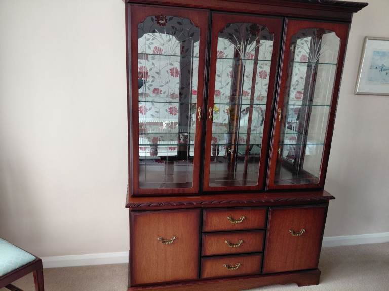 Lovely mahogany display cabinet with glass at back 2 cupboards and 3 drawers excellent condition