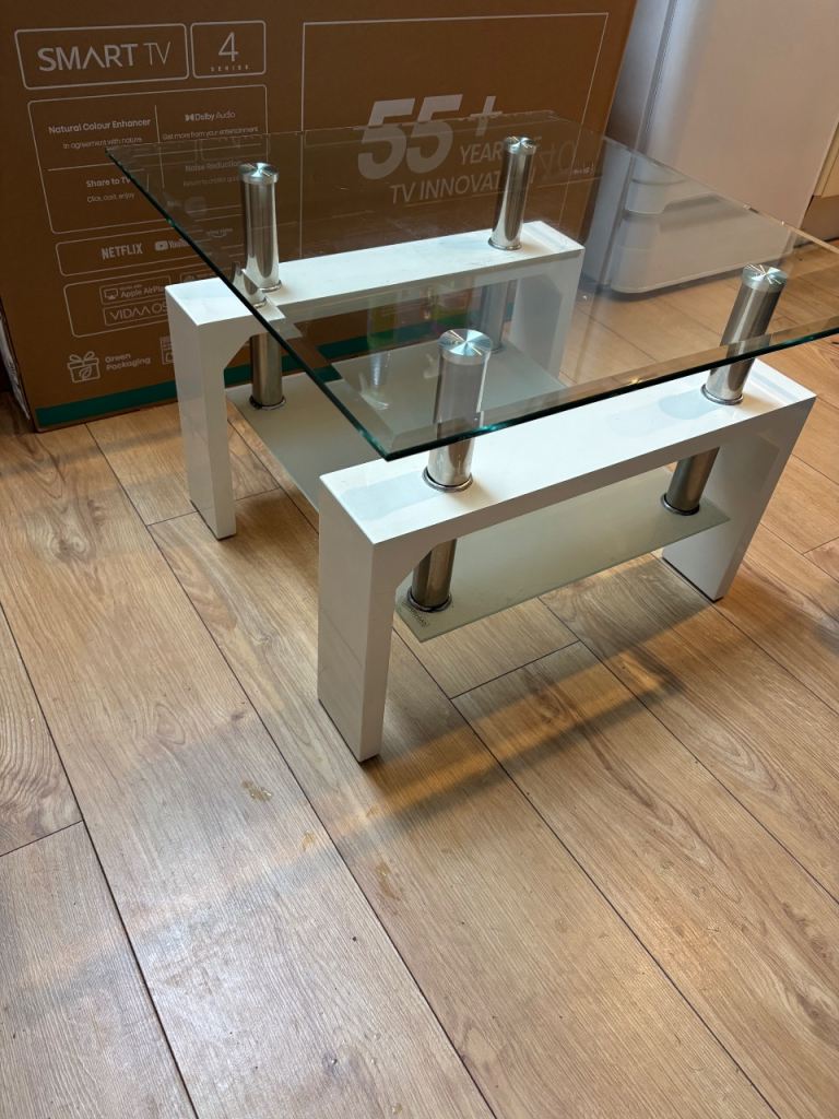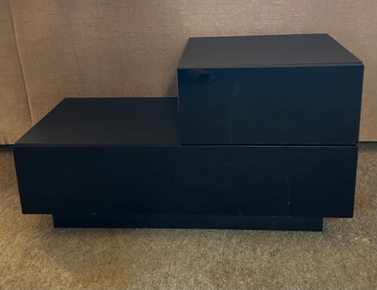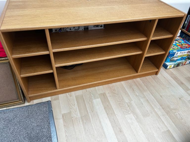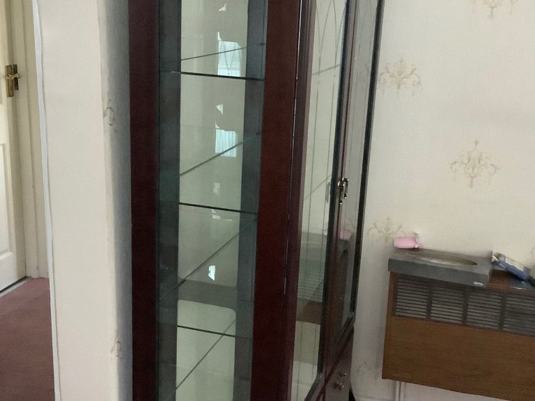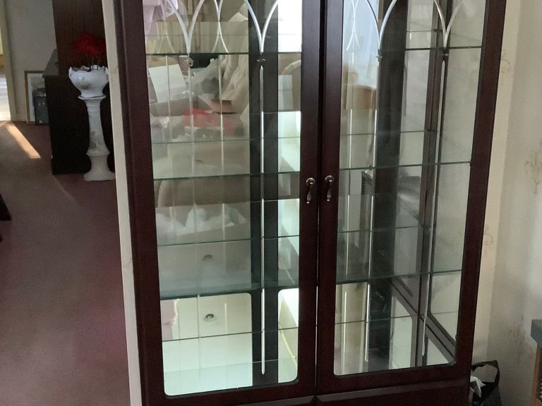 Wooden display unit with glass shelves and glass doors with cupboards under …