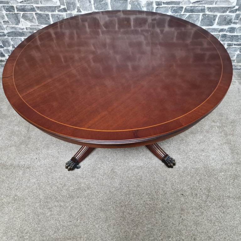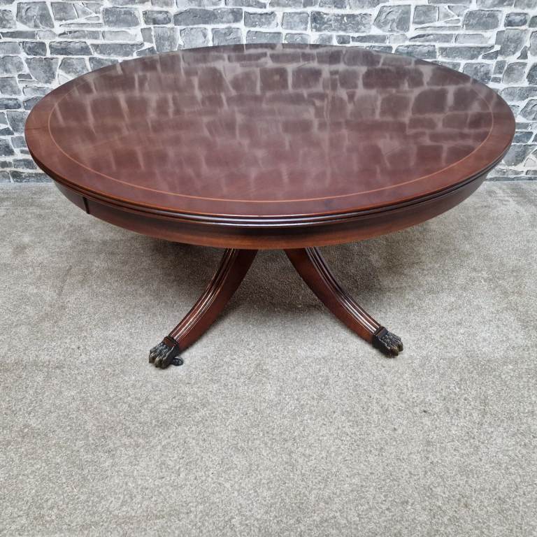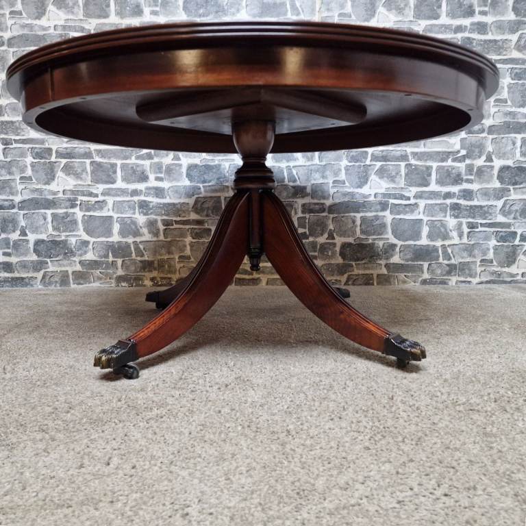 Elegant low table finished in a rich mahogany tone, featuring a beautifully inlaid circular top and a solid central pedestal base. The table stands on curved legs with decorative metal paw feet, all fitted with castors, making it easy to move despite its solid build.