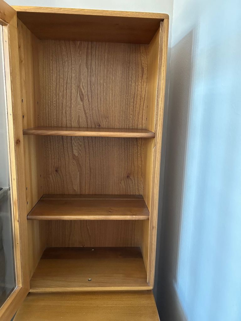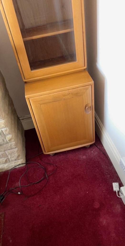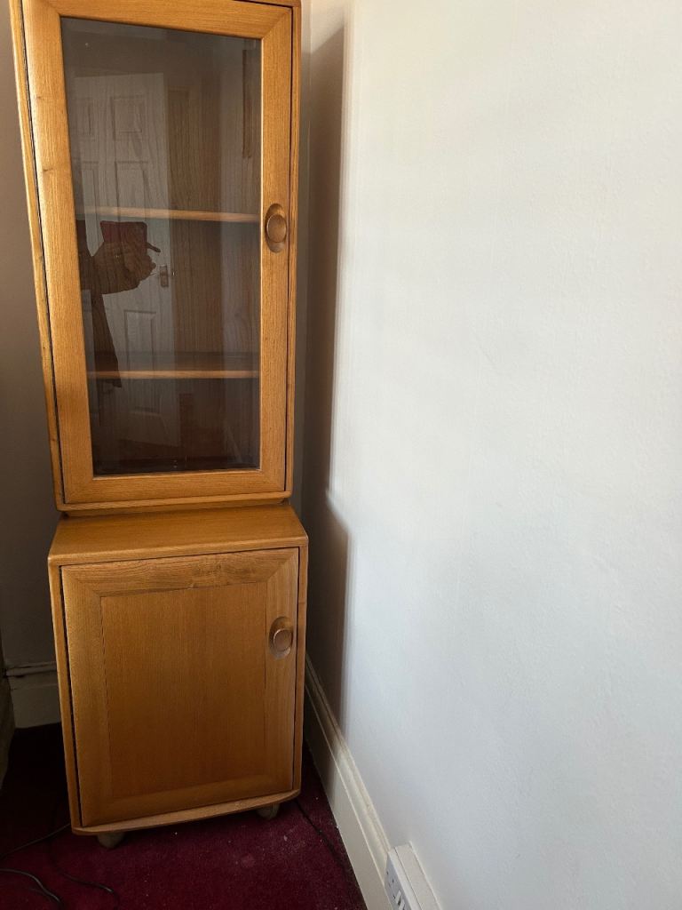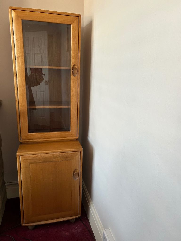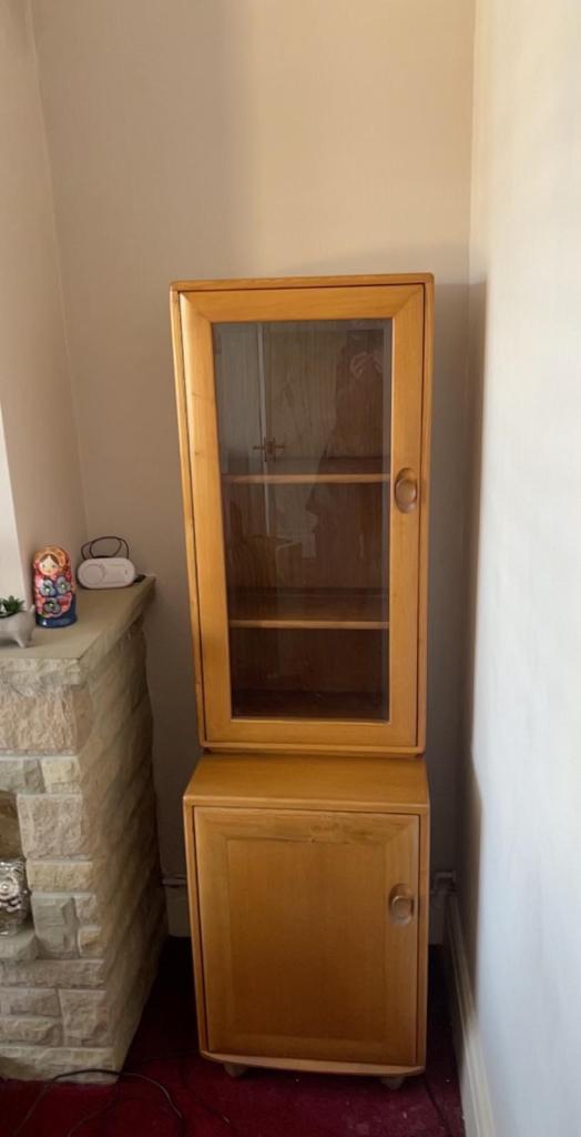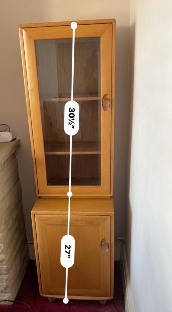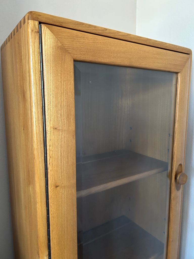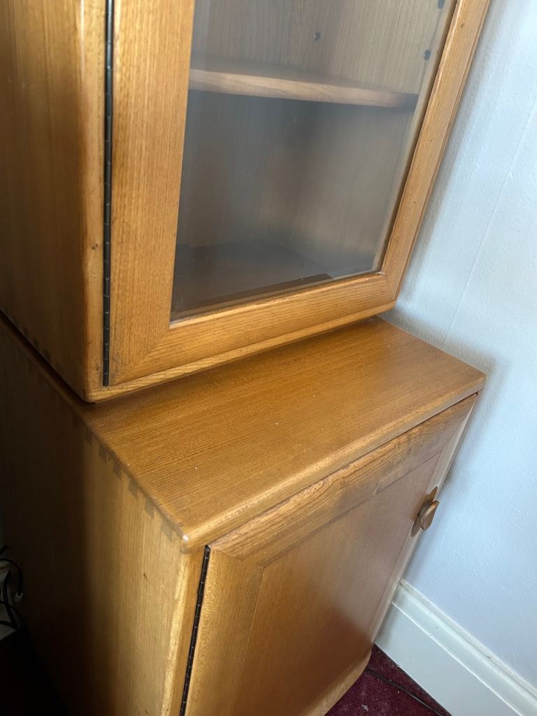 ERCOL display cabinet in excellent condition. Made in 2 units from solid elm with glazed upper section ideal for displaying ceramics, glassware or collectables. A practical lower section cupboard with one shelf. An excellent example of British craftsmanship.