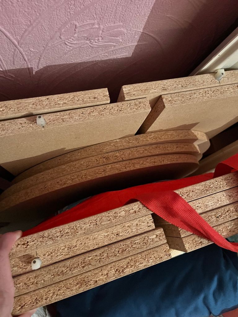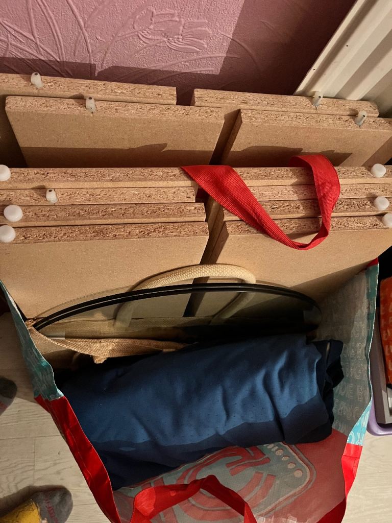 Flat pack tables that slot into each other have three tables but only two glass tops and two clothes for them
