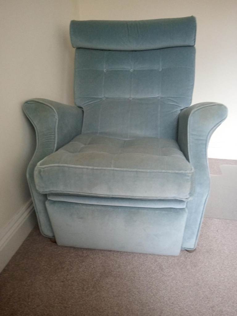 This recliner is incredibly comfortable and gives excellent back and leg support. It comes from a non-smoking, pet-free home and is in excellent condition. It has been re-upholstered and re-covered in light turquoise velvet. Free to collect from central Ringwood. It is very easy to recline and bring back to normal sitting position.