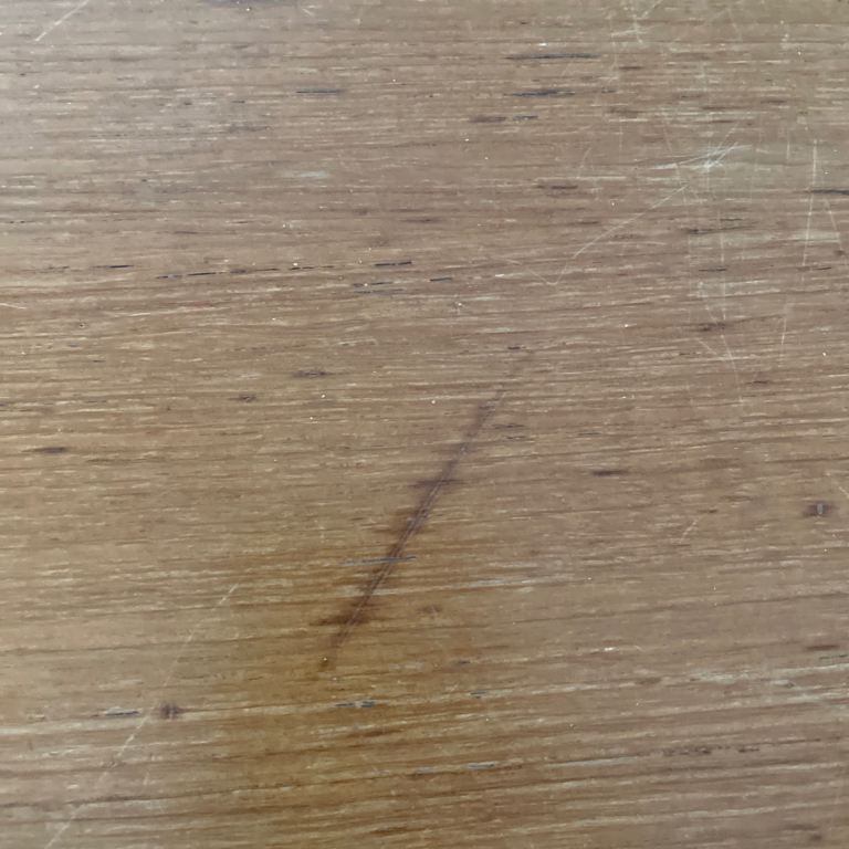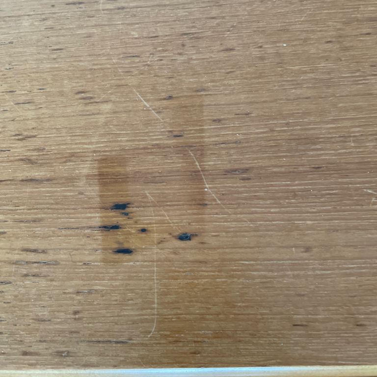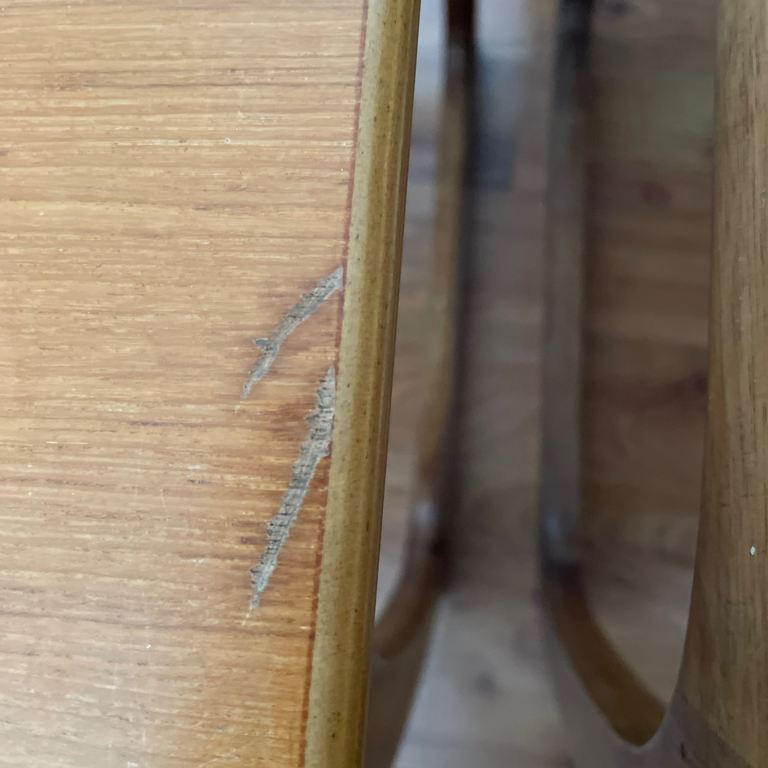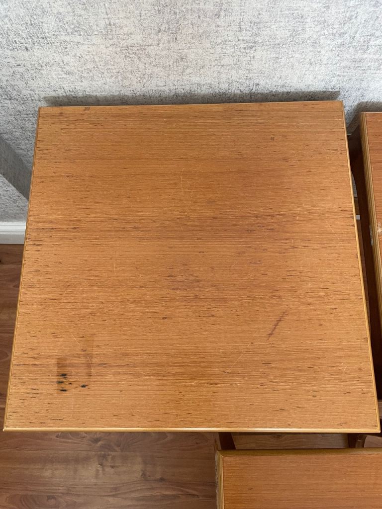 There is a small dark wood grain mark on the larger table top and 4 wood scuffs see pictures, but this does not distract from its vintage look.