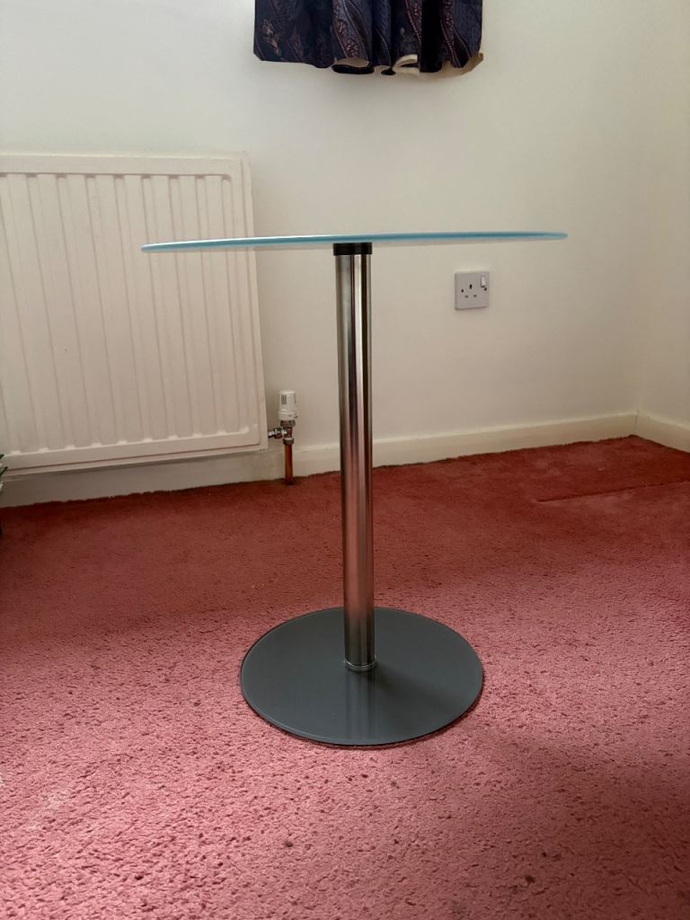 A glass & chrome side table, round base & top. Base 30cm diameter, top 43cm diameter & height 51cm. Buyer Collects only. FREE