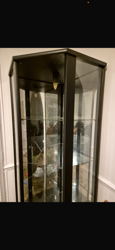 Corner glass display cabinet with built in lights.