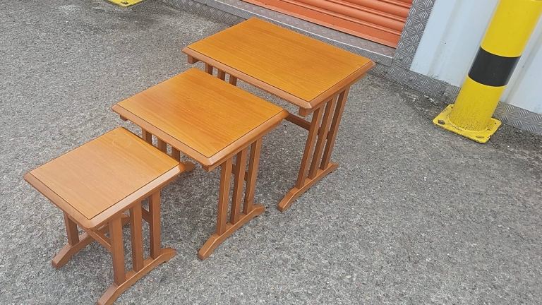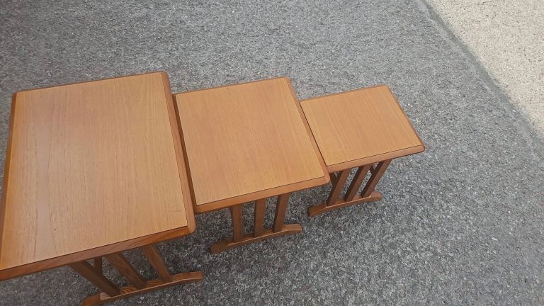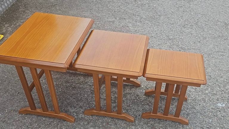 Gplan solid teak nest of tables there in good solid condition there is some age related wear to the tops but nothing major. They are large 58 cms wide 45 cms deep and 51 cms tall. Medium 44 cms wide 41 cms deep and 45 cms tall. Small 31 cms wide 37 cms deep and 41 cms tall. We can deliver single items for an extra £5 within Newport or Cardiff. Collection can be made from Malpas Newport NP20.