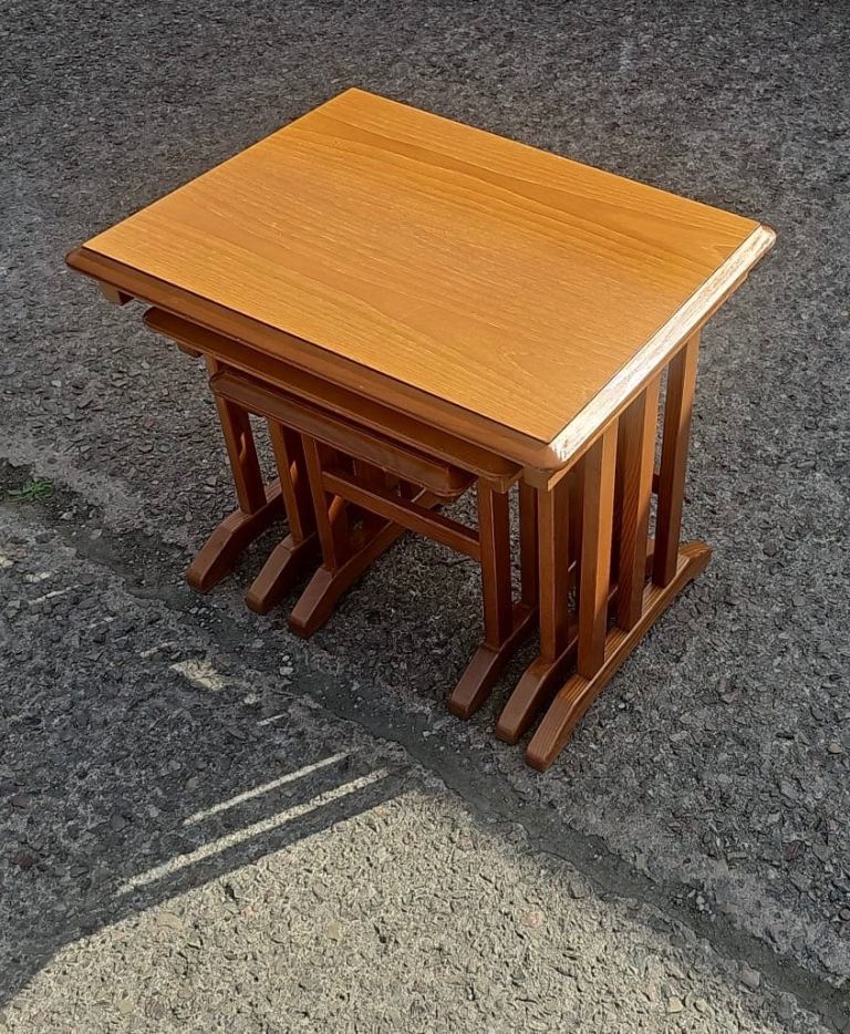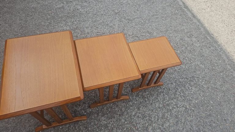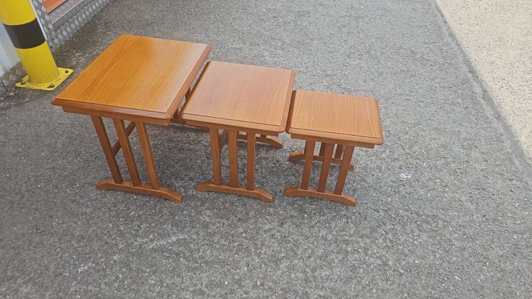 Gplan solid teak nest of tables there in good solid condition there is some age related wear to the tops but nothing major. They are large 58 cms wide 45 cms deep and 51 cms tall. Medium 44 cms wide 41 cms deep and 45 cms tall. Small 31 cms wide 37 cms deep and 41 cms tall. We can deliver single items for an extra £7.50 anywhere within Newport or Cardiff. Collection can be made from Malpas Newport NP20.