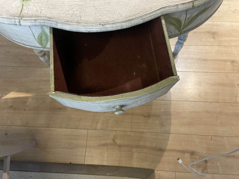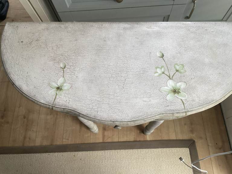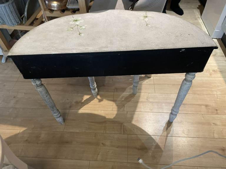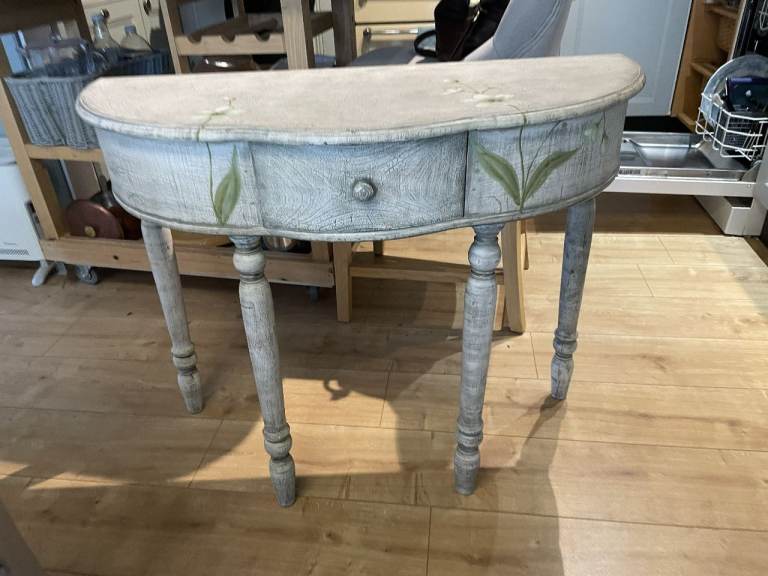 For sale : A half moon shaped side table with single draw. Dimns: 36 inches long X 15 inches depth x 28.5 inches high. (91.5 cms. long x38 cms. high x72 cms. high) From a smoke & pet free home.