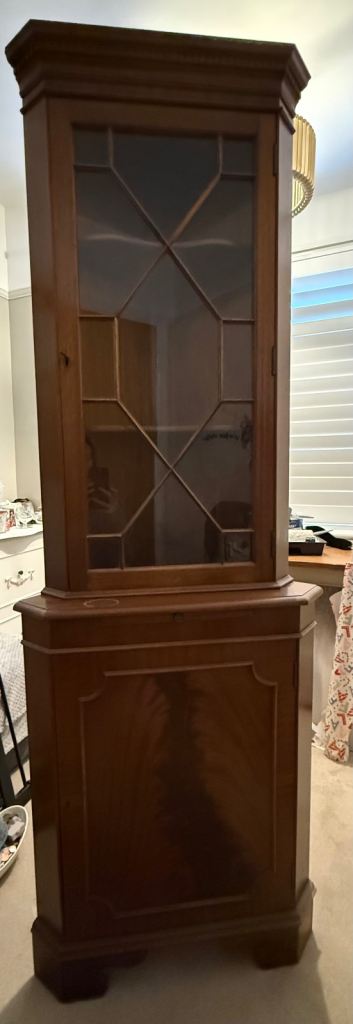 Large wooden cabinet, new door knobs and newly wired lights in glass cupboards.